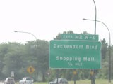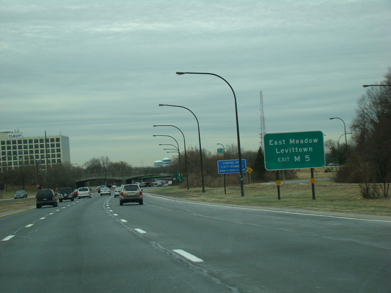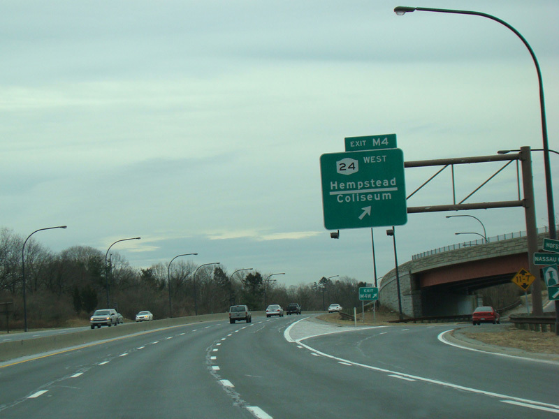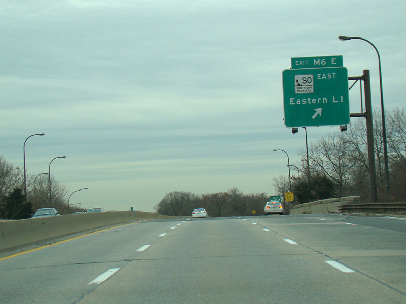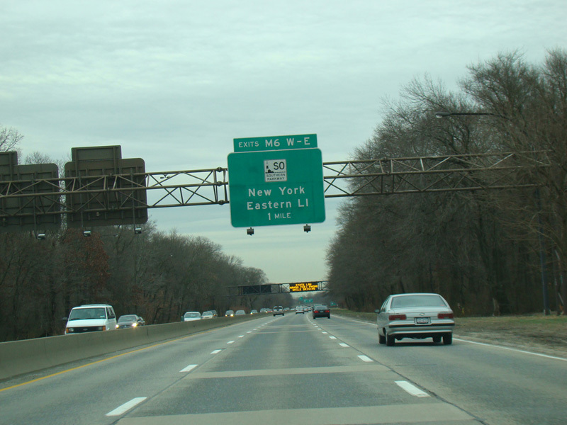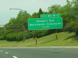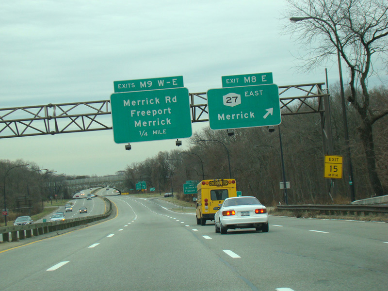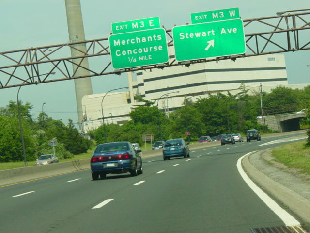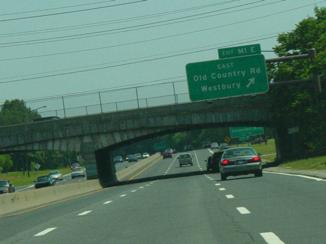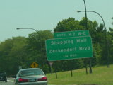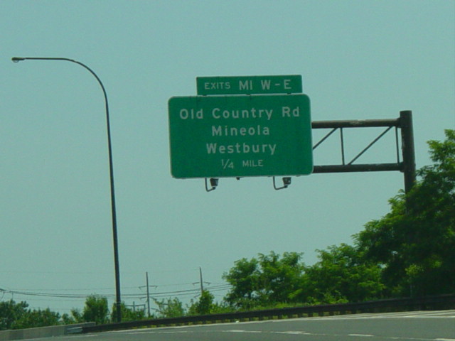 This sign for exits M2W-E was found on the southbound Meadowbrook Parkway and had the two lines, "Zeckendorf Boulevard" and "Shopping Mall," backwards. (The exit for the Roosevelt Field shopping mall comes first.) It has been replaced with a new sign that has the lines in the right order.