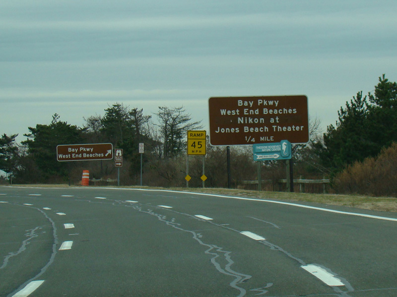 This sign for the Bay Parkway was replaced when the Nikon at Jones Beach Theater was renamed the Northwell Health at Jones Beach Theater.