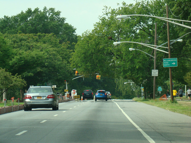 Pelham Parkway is a large six-lane divided road. For much of its length, it has service roads. While it is designated a parkway and closed to trucks, it has traffic lights at all its intersections except for the interchanges with the Hutchinson Parkway and I-95.