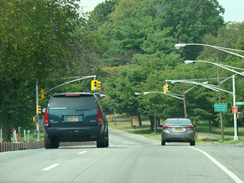 Pelham Parkway runs west as a large six-lane divided road. There are traffic lights with oversized street name signs at Eastchester Road and Williamsbridge Road.