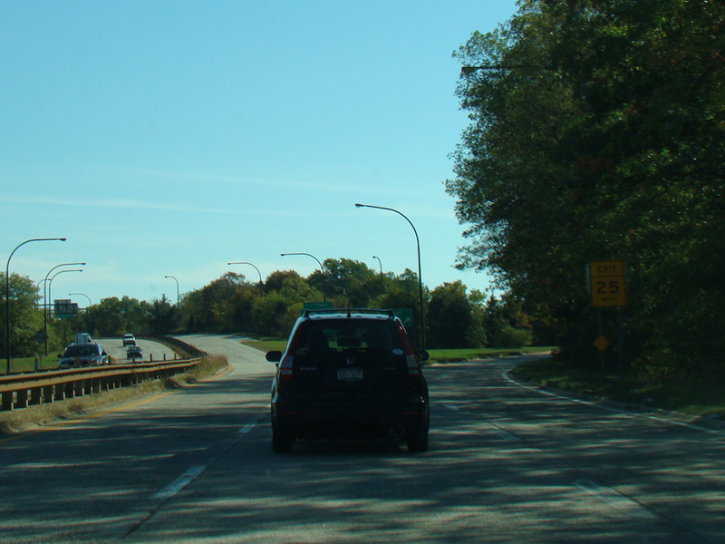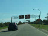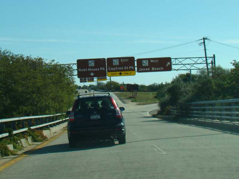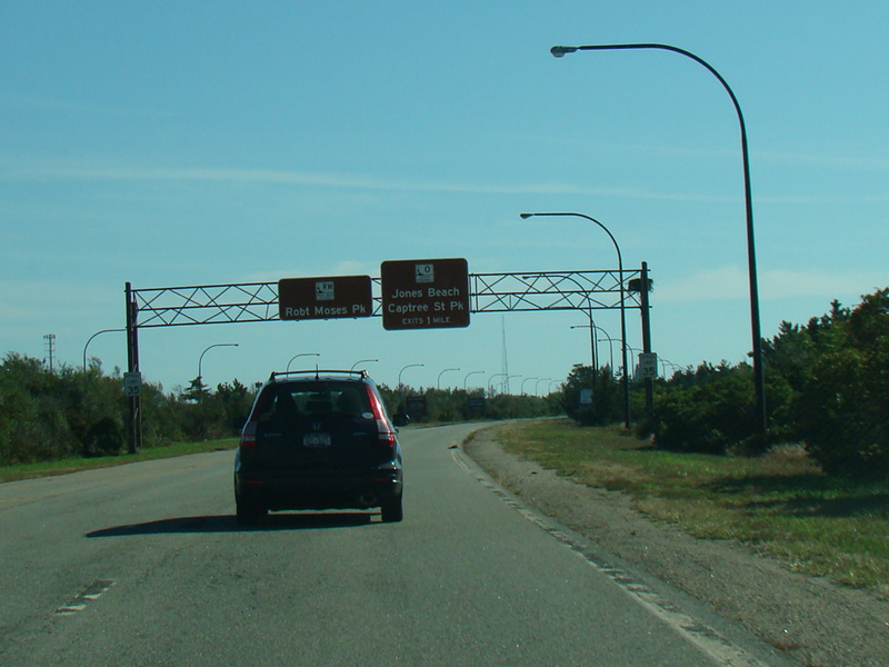 The Robert Moses Causeway begins at the Southern Parkway. Exits RM1W-E are for Sunrise Highway (NY 27).