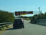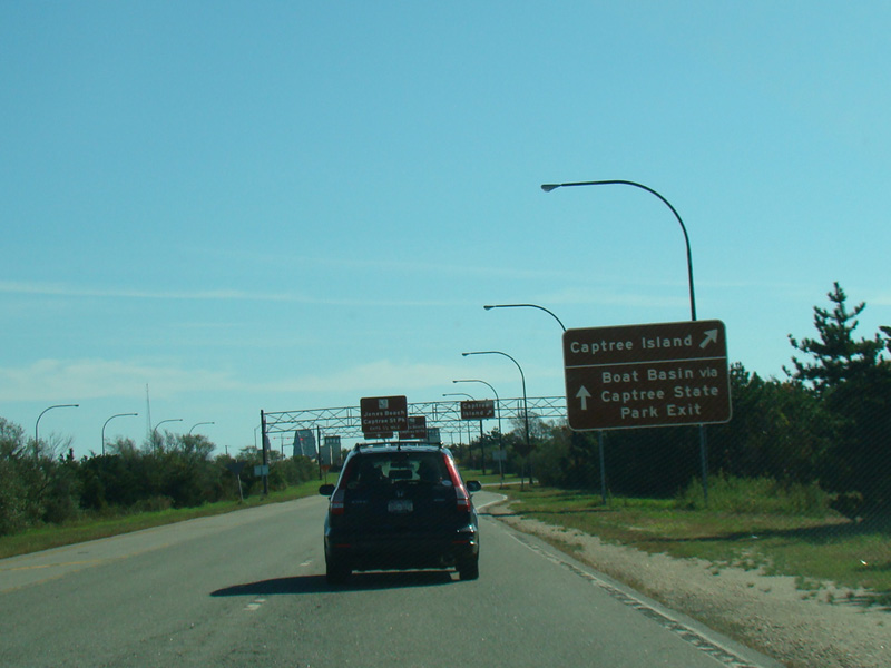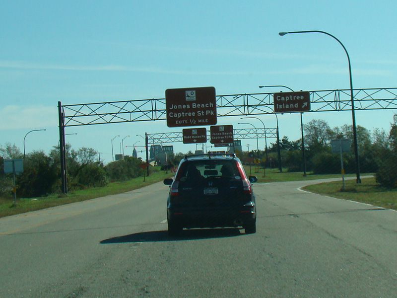 On the other side of the bridge, there are signs for the interchange with the Ocean Parkway ahead, as well as signs giving the fees to park at Captree State Park and Robert Moses State Park.