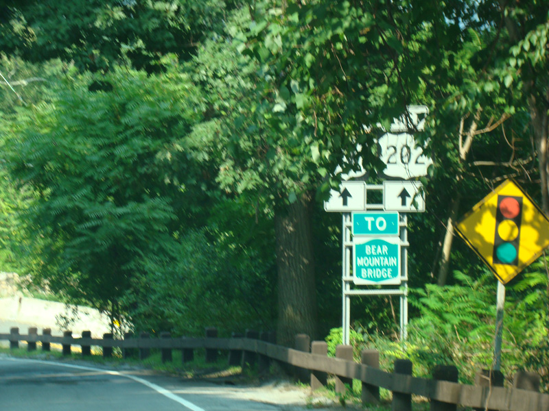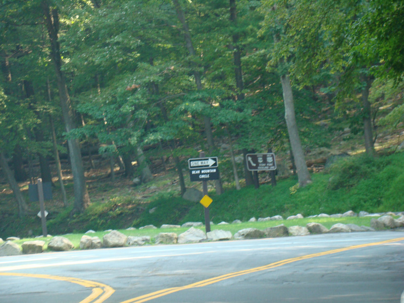 After the circle, Seven Lakes Drive runs northeast. A sign instructs motorists to continue straight ahead for US 9W and the Bear Mountain Bridge (US 6/US 202).