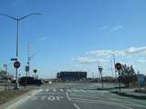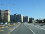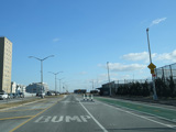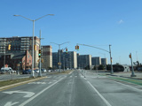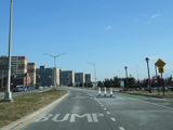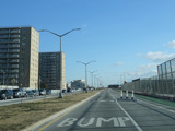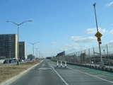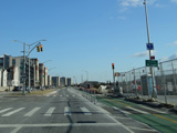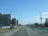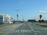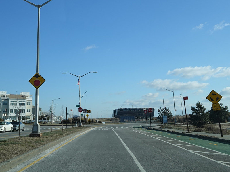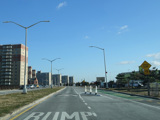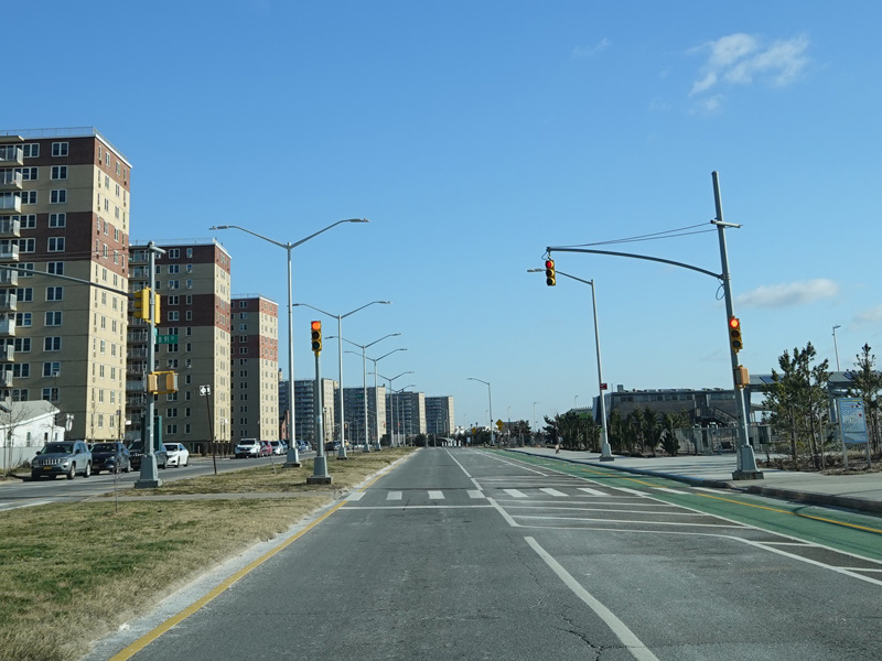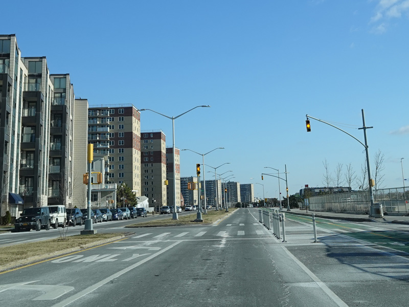 The Shore Front Parkway runs east through the Rockaways as a two-lane divided road with a bike lane. There are copious speed bumps along this section.
