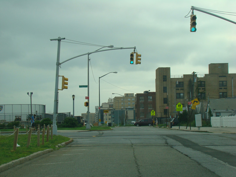 The Shore Front Parkway ends here at Beach 108 Street. All motorists must turn right.