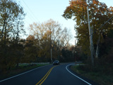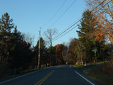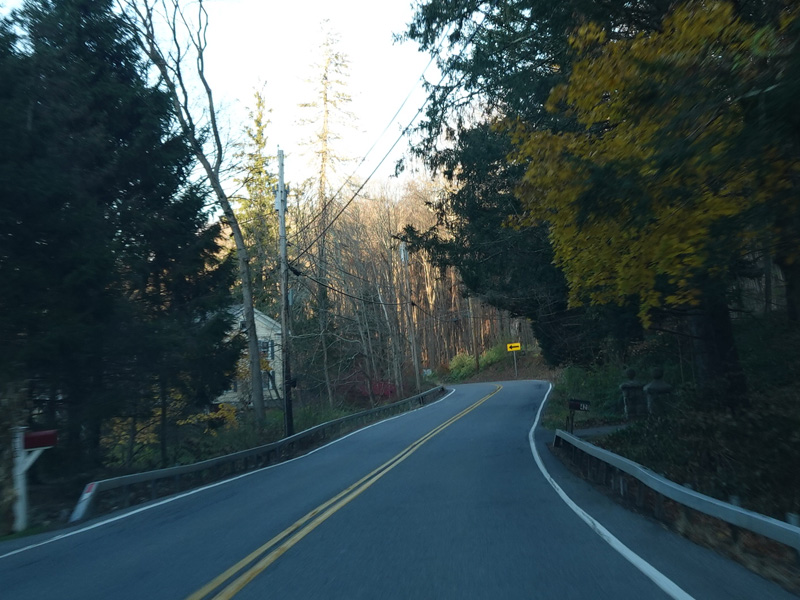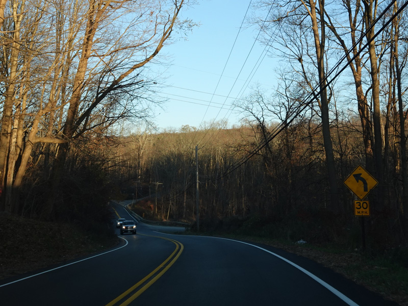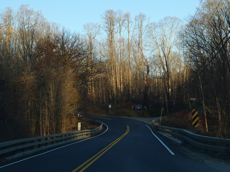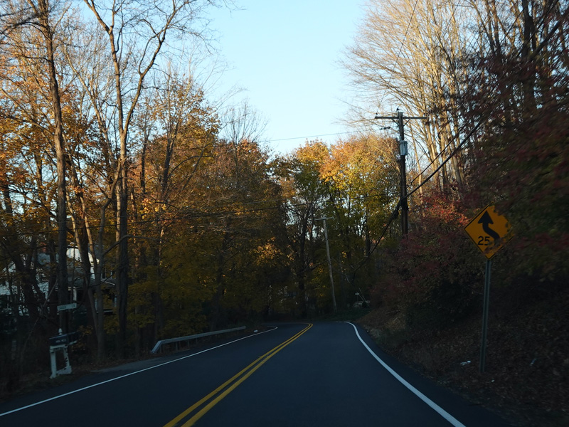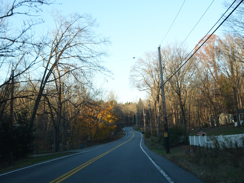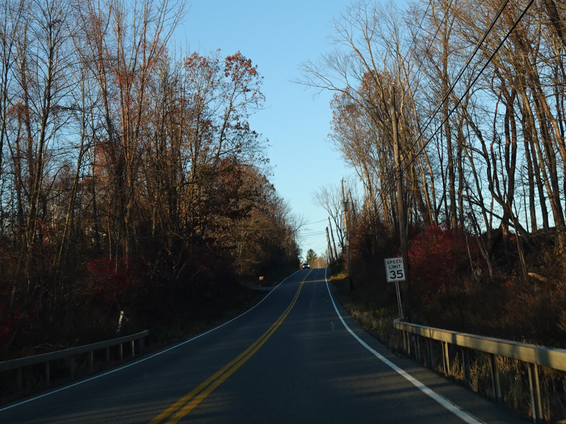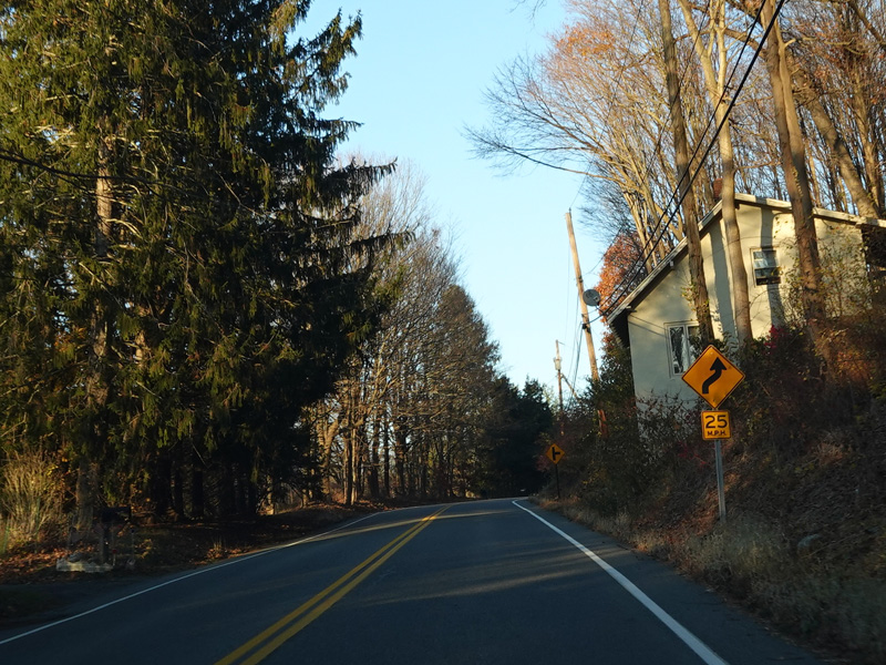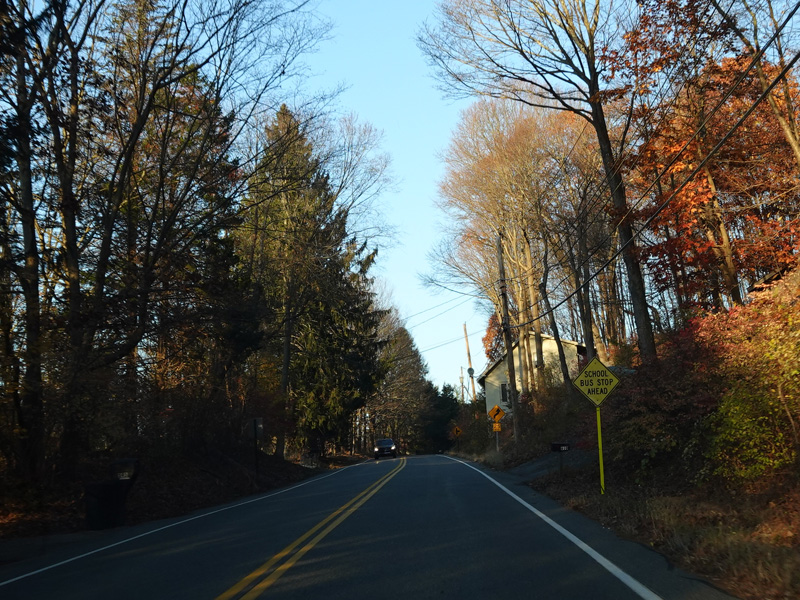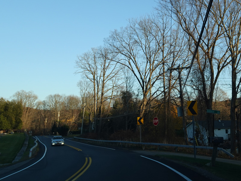 Milltown Road curves to the north and runs along the state line. Here, the left side of the road is New York, and the right side is Connecticut.