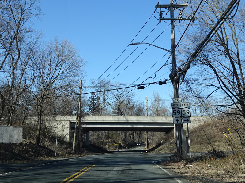 There is a grade-separated partial interchange with NY 59. Turn right at the ramp to go east.