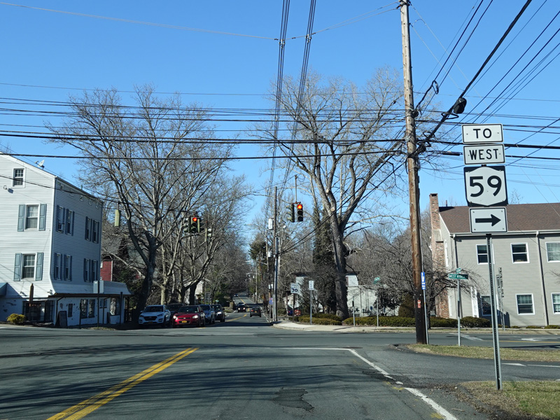 Sickletown Road ends at a traffic light at West Nyack Road. Turn right for a westbound entrance to NY 59. Continue straight ahead onto Strawtown Road to stay on CR 23.