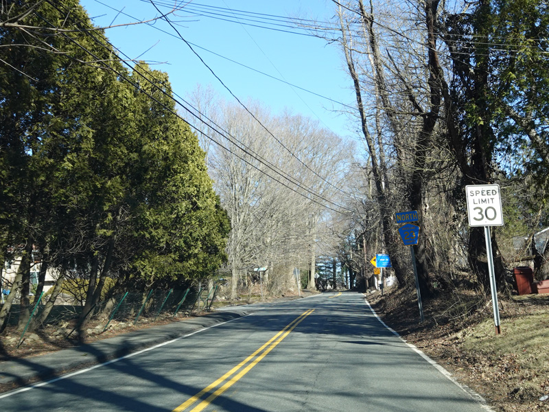 Blue Hill Road South ends at a traffic light at Veterans Memorial Drive (CR 20). Turn right to go east or left to go west. To stay on CR 23, turn right and then immediately left onto Blue Hill Road. There is only signage for CR 23, not for CR 20.