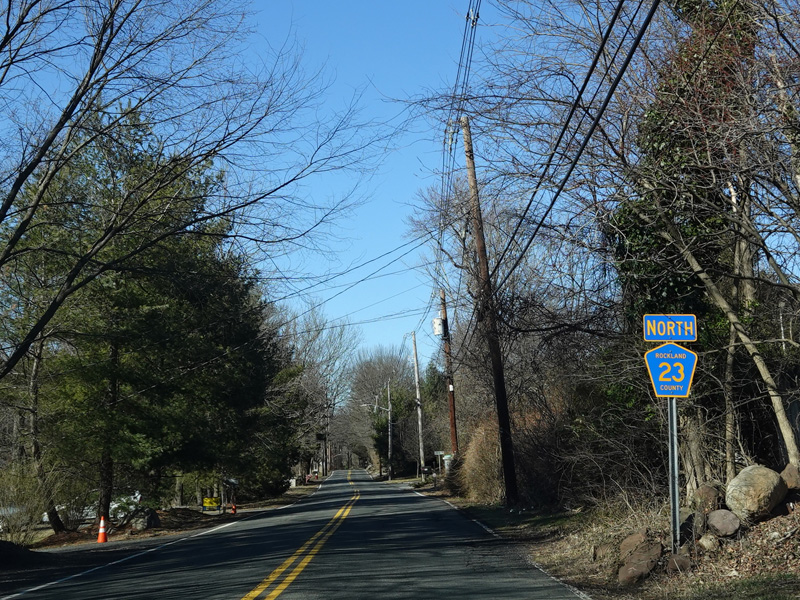 Welcome to New York and to Rockland County! There is no welcome sign for the state, only one for the county. Orangeburgh Road (Bergen CR 2) becomes Blue Hill Road South at the state line.
