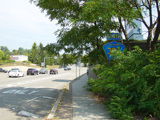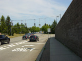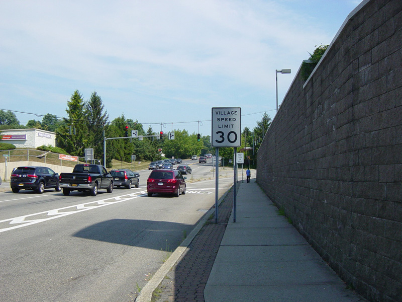 New Clarkstown Road begins at NY 59. The first block is a four-lane divided road. At the traffic light, Perlman Drive is to the left and the Spring Valley Marketplace shopping mall is to the right.