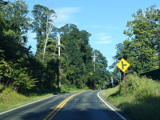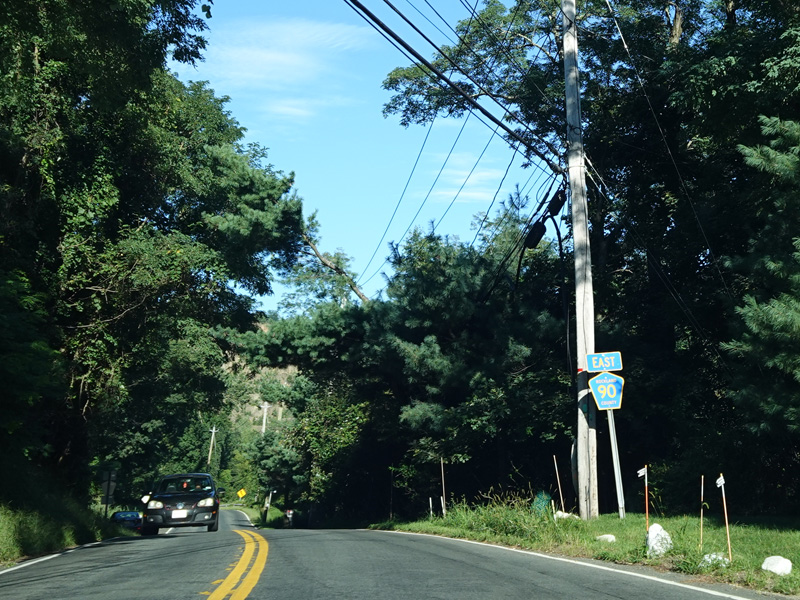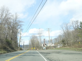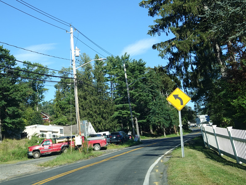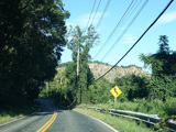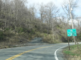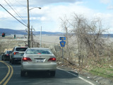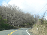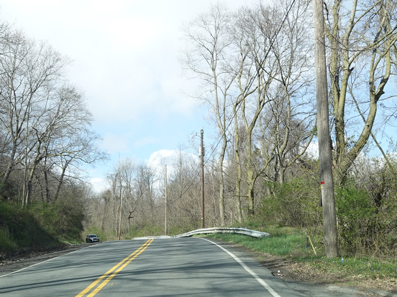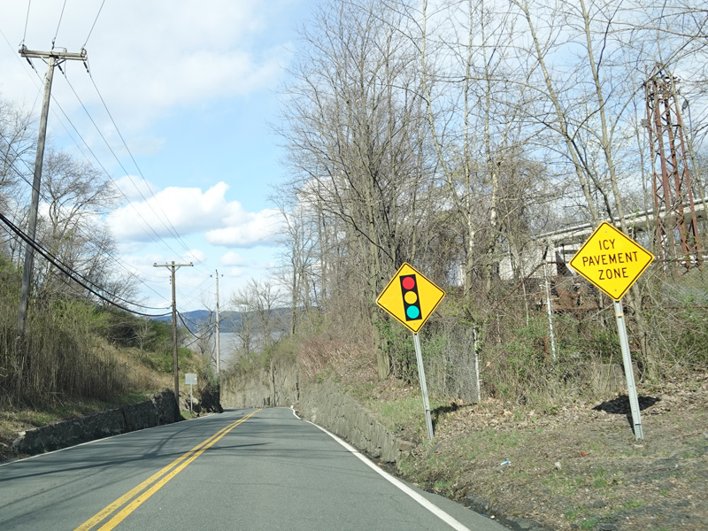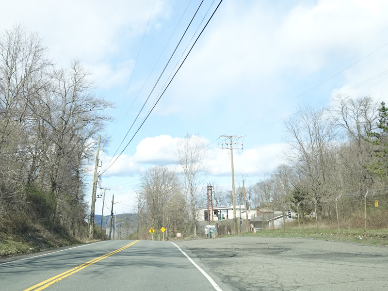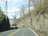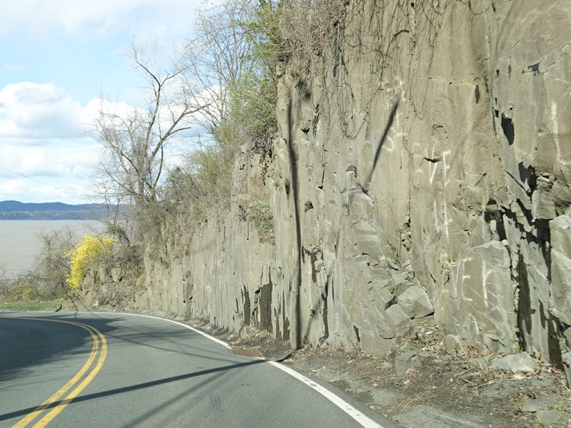 Haverstraw Road goes down a hill toward the Hudson River. There are cliffs along the right side.