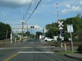 There is a railroad crossing at the freight rail line along the Hudson River.