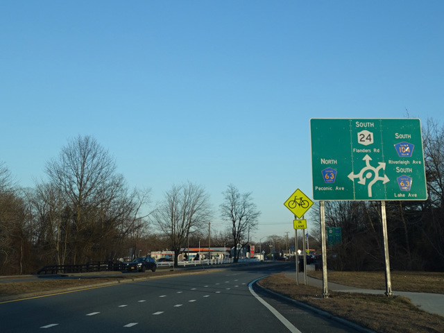 NY 24 begins at the Long Island Expressway (I-495) nears its eastern terminus. The first section is Nugent Drive, a four-lane divided highway running east to the south of the Peconic River. It is maintained by the county and is also designated CR 94. Continuing to the east, Nugent Drive changes names to become Center Drive. At the end of Center Drive, there is a major traffic circle. CR 94 ends at this point. NY 24 becomes a two-lane undivided road and curves to the southeast. It is known as Flanders Road and then changes names to become Riverhead-Hampton Bays Road. Near the southern terminus in Hampton Bays, it widens to four lanes again. There is a cloverleaf interchange with Sunrise Highway (NY 27). Immediately thereafter, NY 24 ends at Montauk Highway (CR 80).