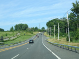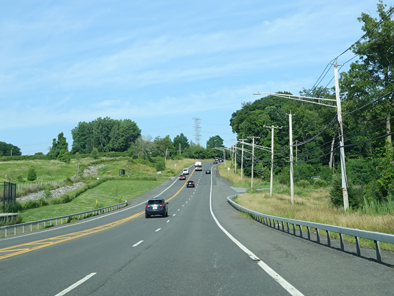 An overpass carries Grasslands Road over Saw Mill River Road (NY 9A). There is an entrance ramp to northbound NY 9A on the left immediately after it.