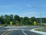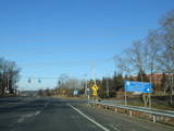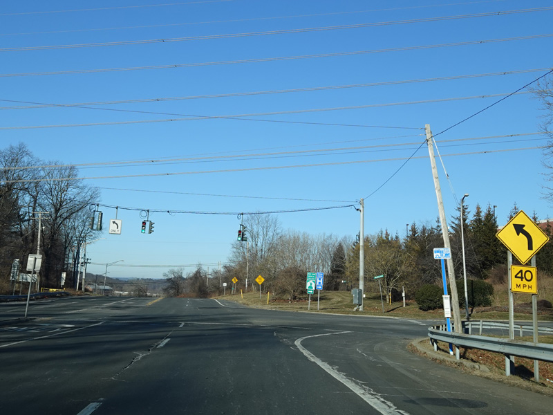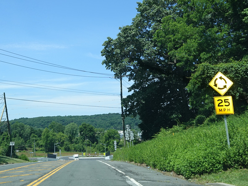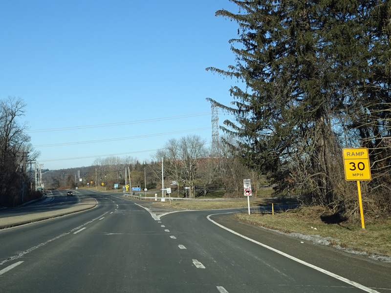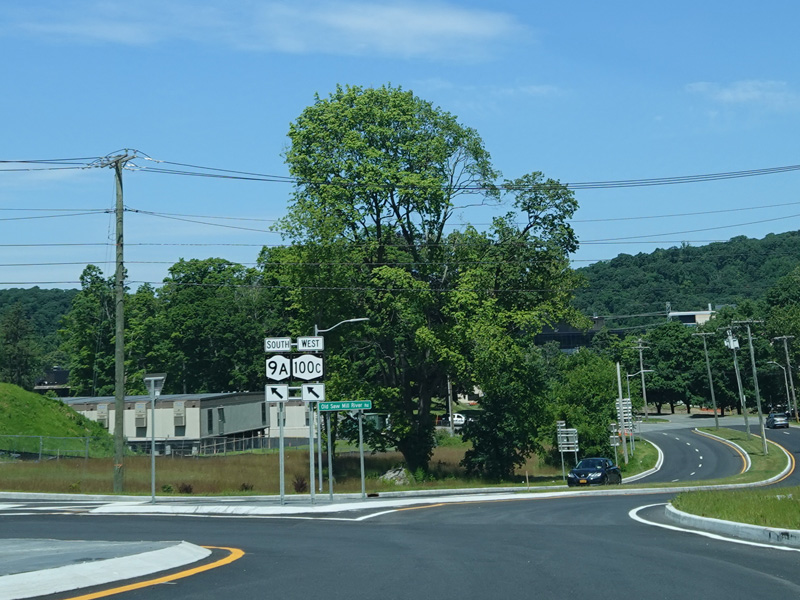 There is a grade-separated interchange with Saw Mill River Road (NY 9A). Turn right before the overpass to go north. On the other side of overpass, there is a roundabout at Old Saw Mill River Road (CR 303), which begins straight ahead. Continue around the roundabout to the left to stay on Grasslands Road toward Saw Mill River Road (NY 9A) south.
