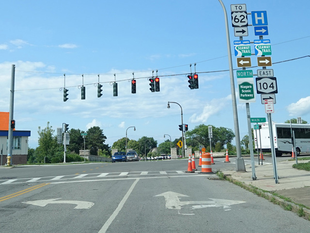 NY 104 is a major east/west route in Western New York. It begins at Niagara Street (NY 384) in Niagara Falls, just east of the Rainbow Bridge. It runs north along First Street, Main Street, and Lewiston Road, passing through an interchange with the Niagara Expressway (I-190) at its last exit before crossing into Canada. A short distance thereafter, Lewiston Road ends at an interchange with the Niagara Scenic Parkway and turns east onto Ridge Road.