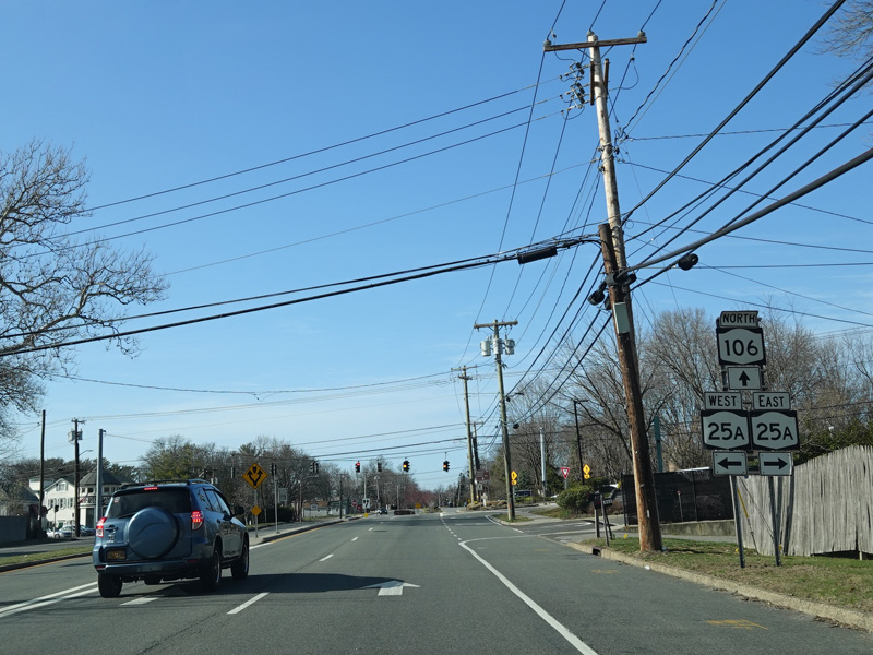 A few miles to the north, NY 106 splits off from NY 107. It is now called Jericho-Oyster Bay Road. It runs north as a four-lane divided highway.