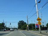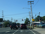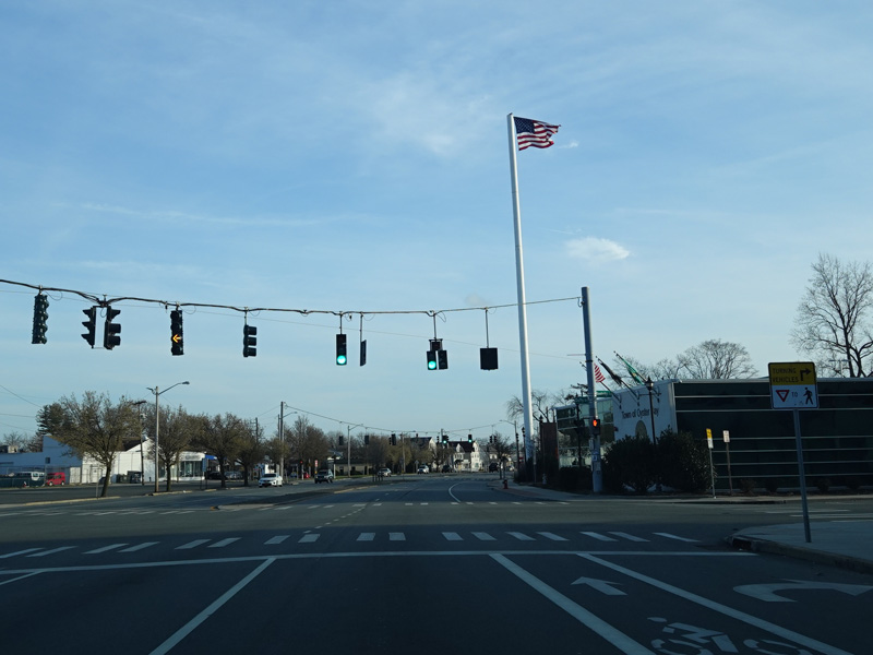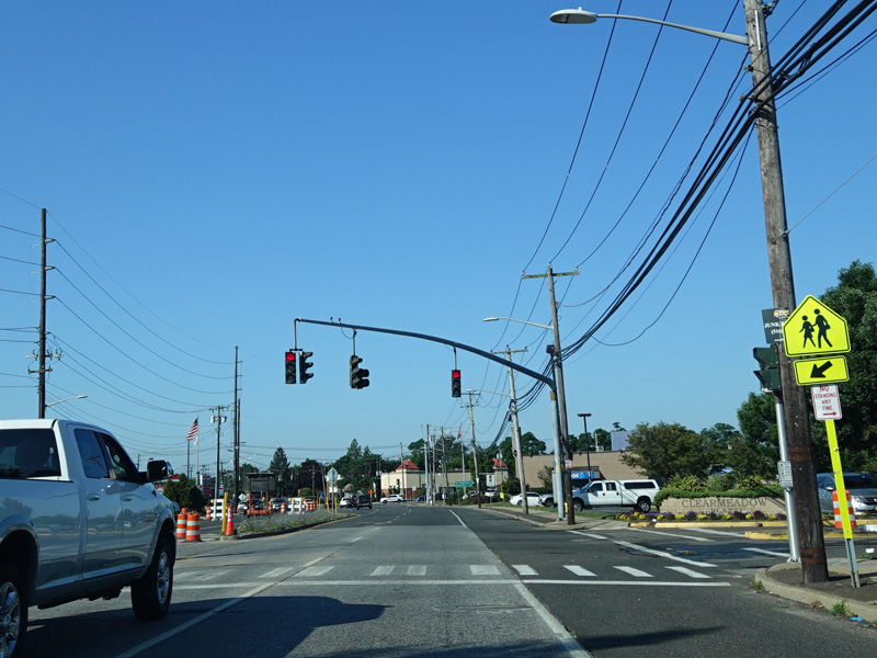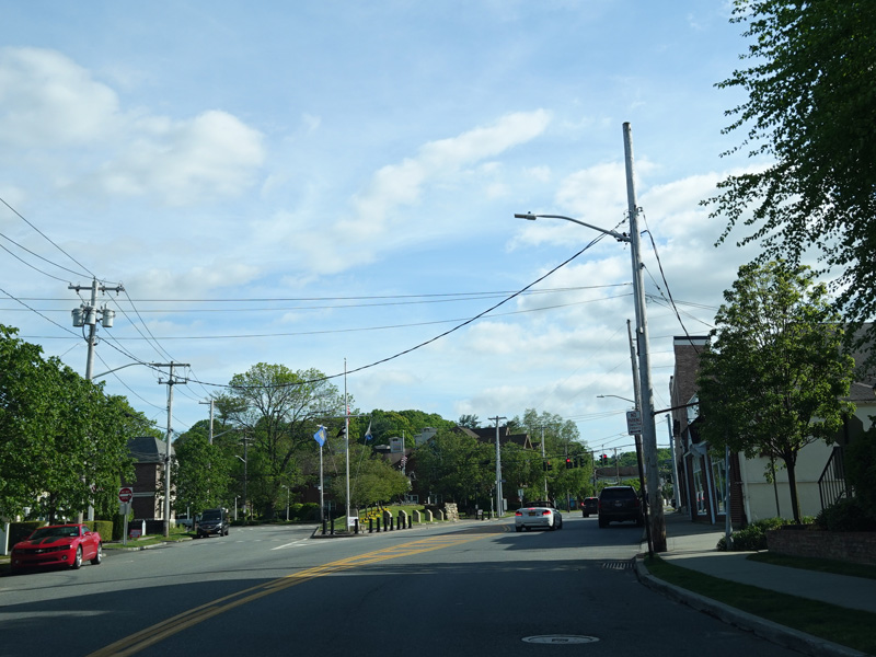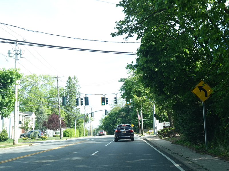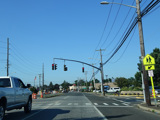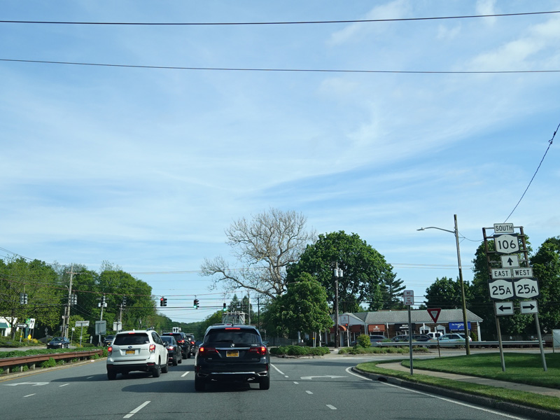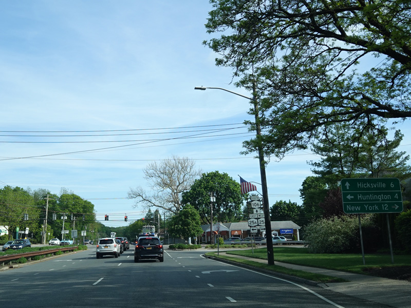Jericho-Oyster Bay Road intersects Northern Boulevard (NY 25A) at a traffic light.