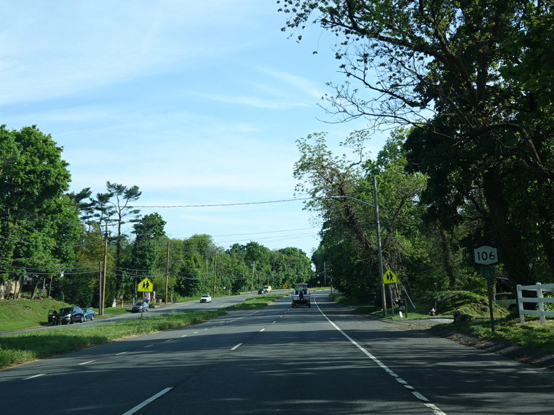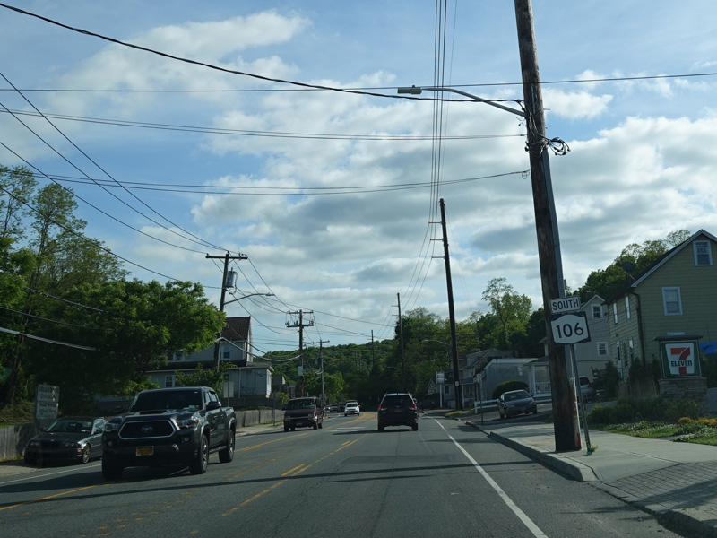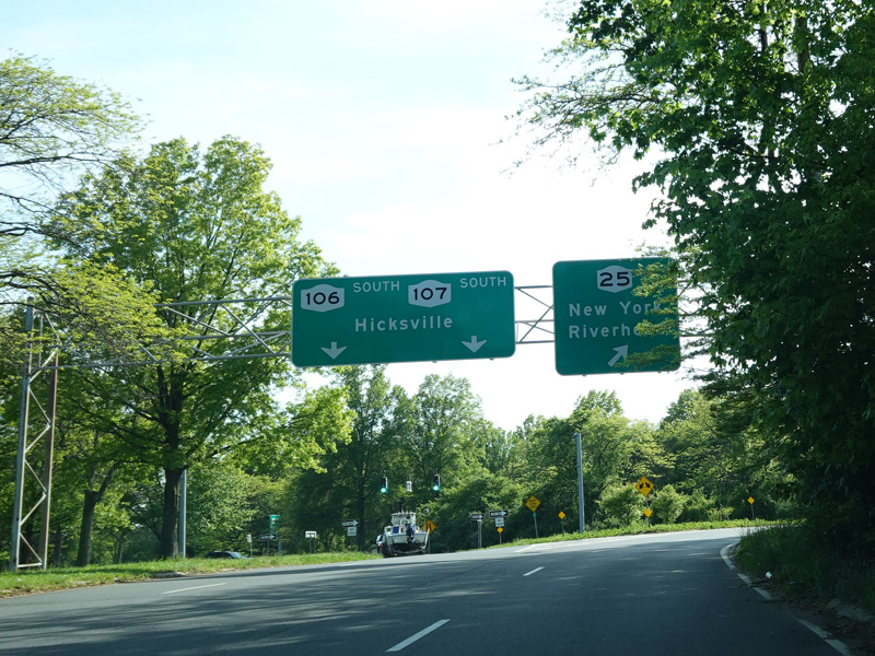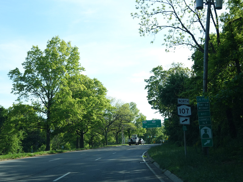 A few miles to the south, NY 106 splits off from NY 107. Here, it is called Newbridge Road.
