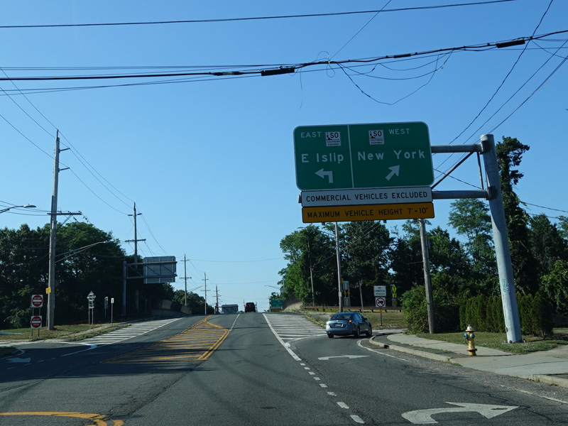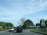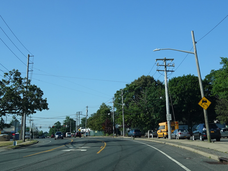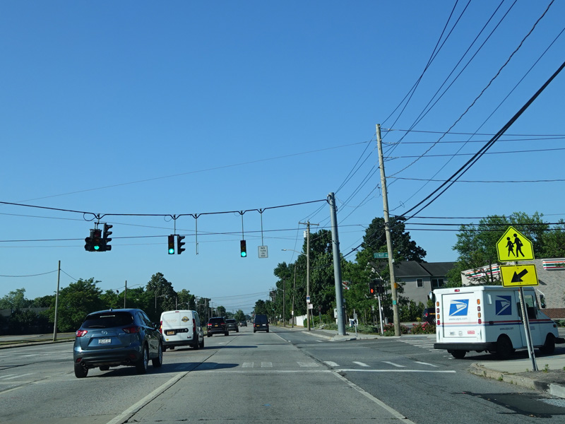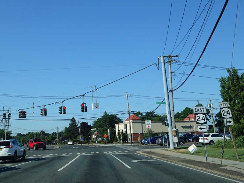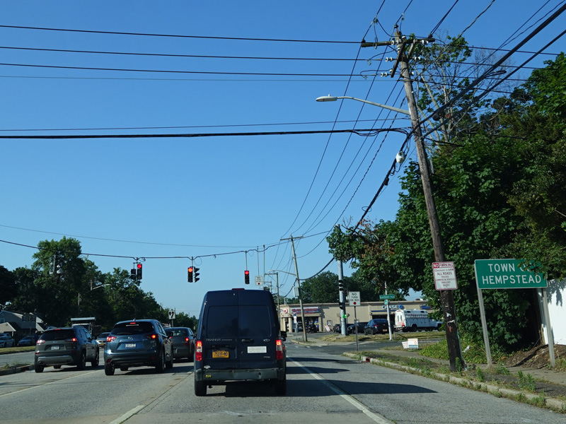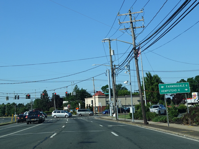 There is a traffic light at Hempstead Turnpike (NY 24). Turn left to go east or right to go west.