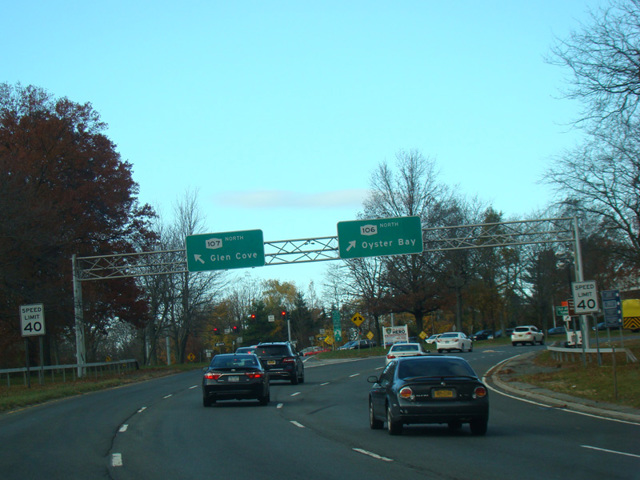 NY 107 begins as Hicksville Road at Merrick Road (CR 27) in Massapequa. It runs to the northwest from there. In the vicinity of Hicksville, it changes name to become Broadway. Just north of Old Country Road (CR 25), it merges with NY 106 and the two are multiplexed along Broadway. There are major intersections with the Northern Parkway, the Long Island Expressway (I-495), and Jericho Turnpike (NY 25). Just north of Jericho Turnpike (NY 25), NY 106 and NY 107 split and NY 107 runs to the northwest as Cedar Swamp Road. North of Northern Boulevard (NY 25A), Cedar Swamp Road merges into Glen Cove Road and NY 107 continues north on Glen Cove Road. At Pulaski Street in Glen Cove, Glen Cove Road becomes Pratt Boulevard (CR 243). NY 107 ends at this point. Pratt Boulevard continues for another two blocks to end at Glen Cove Avenue.