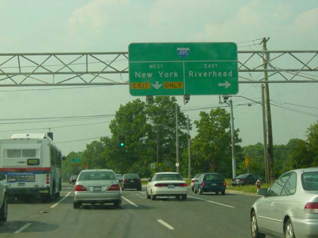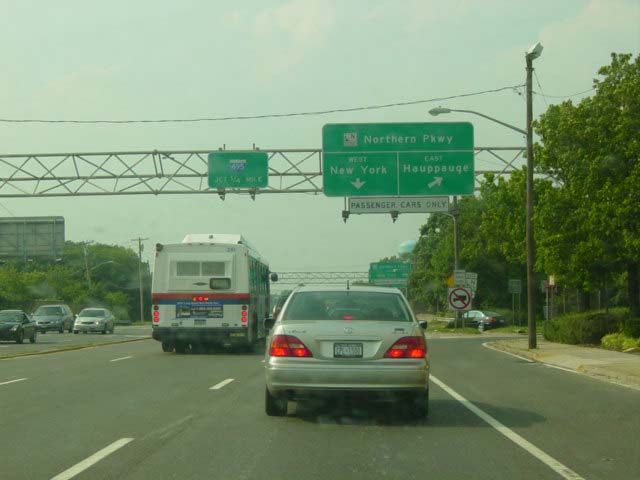 These signs used to be on northbound Broadway (NY 106/NY 107) at its interchanges with the Northern Parkway and the Long Island Expressway (I-495). They have been replaced.