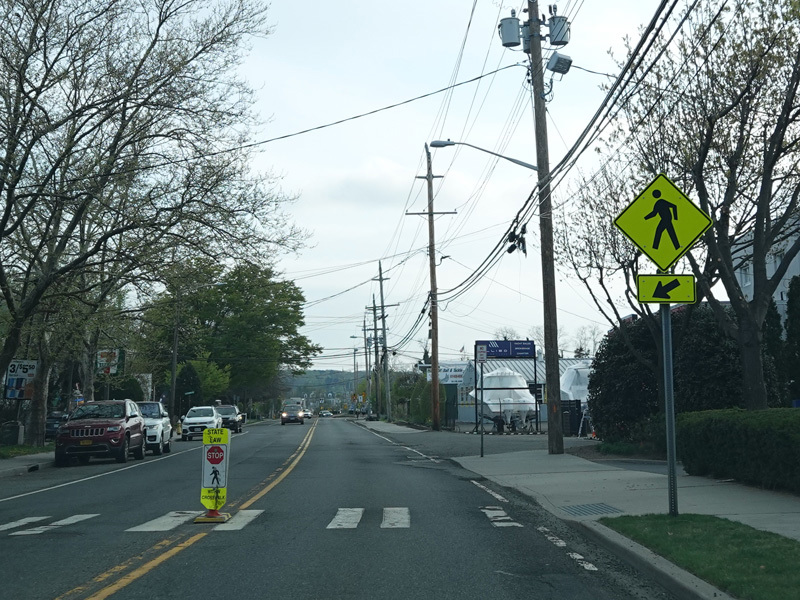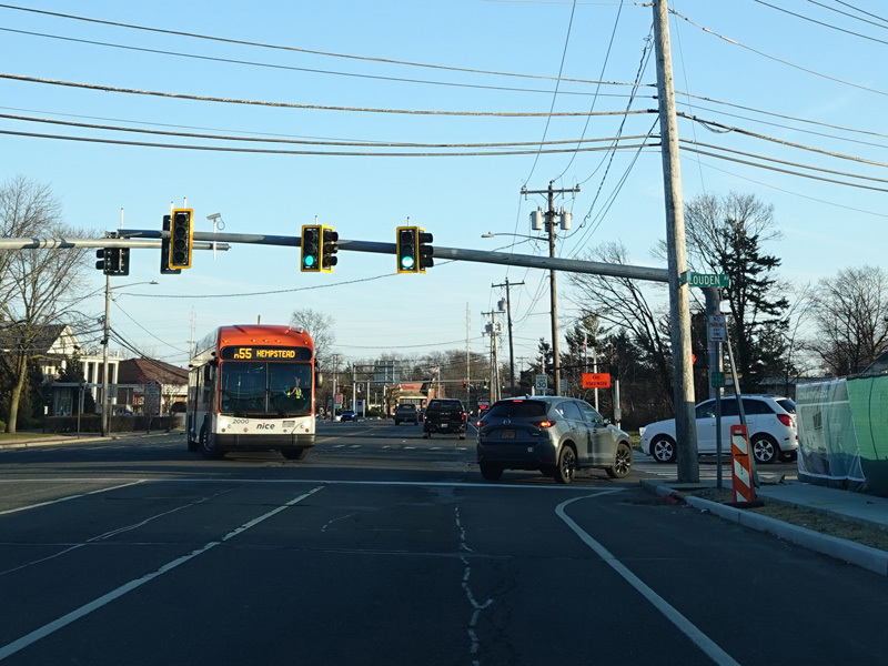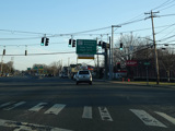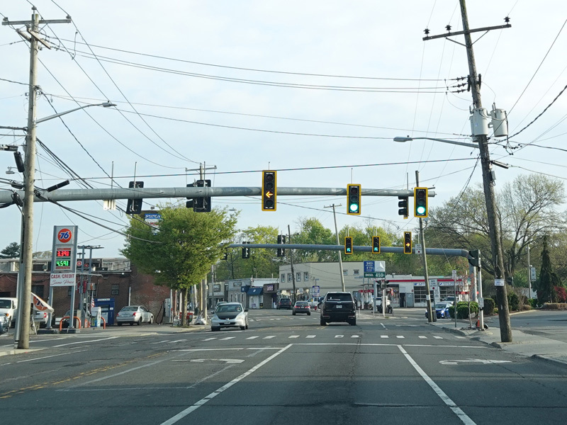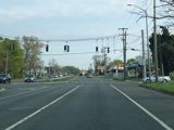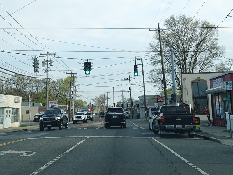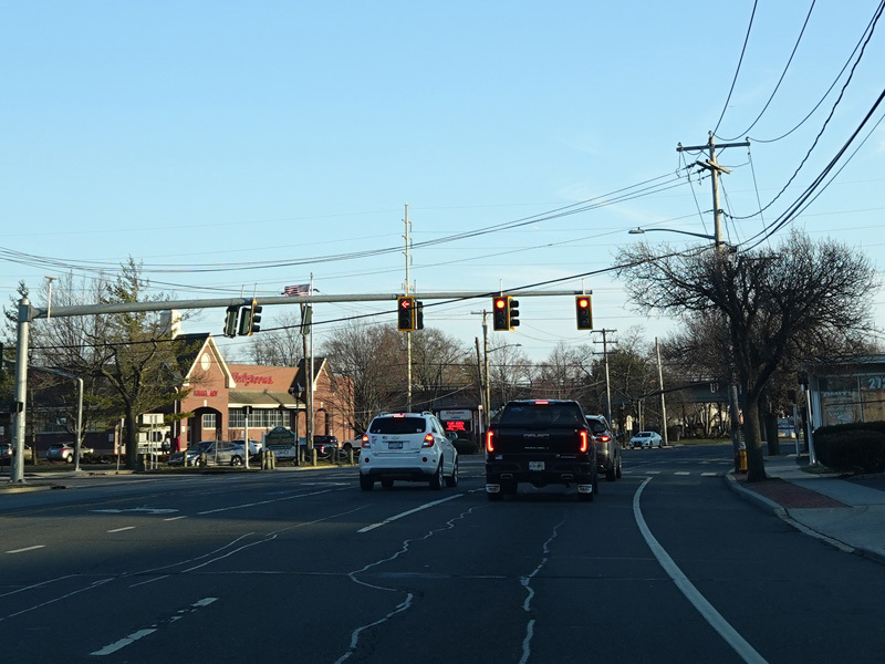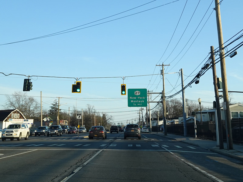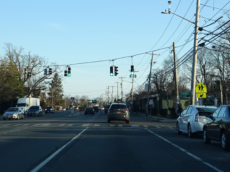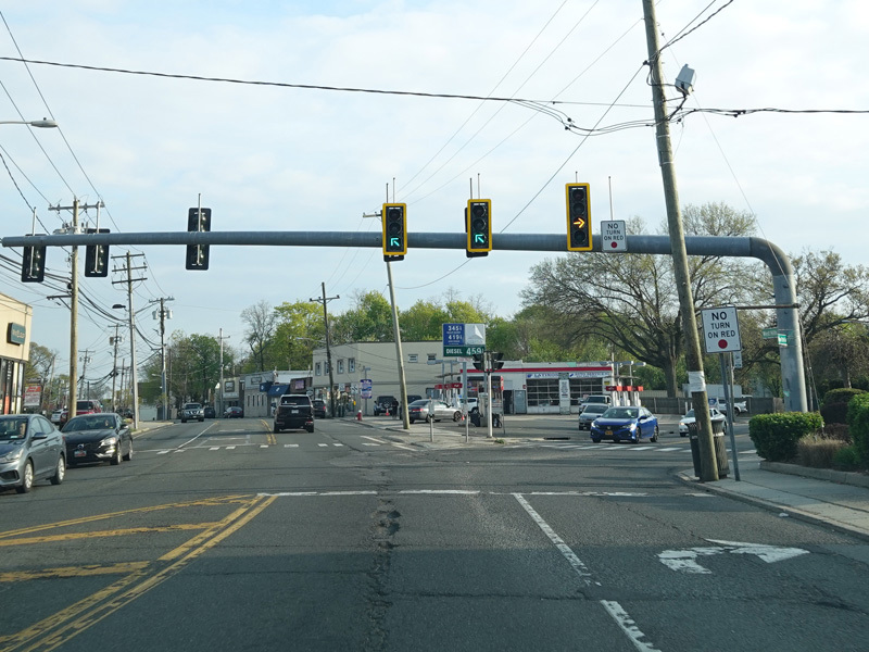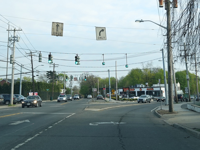There is a traffic light at Main Street (NY 25A). Turn left to go east or right to go west.