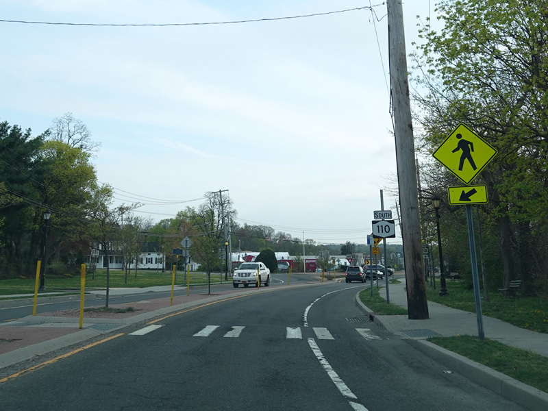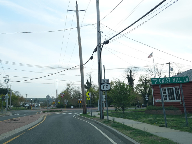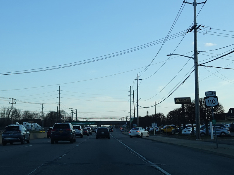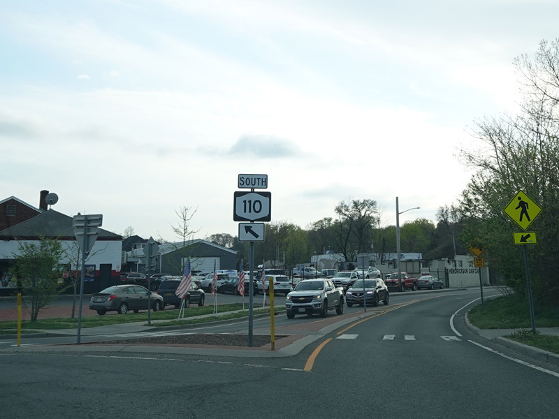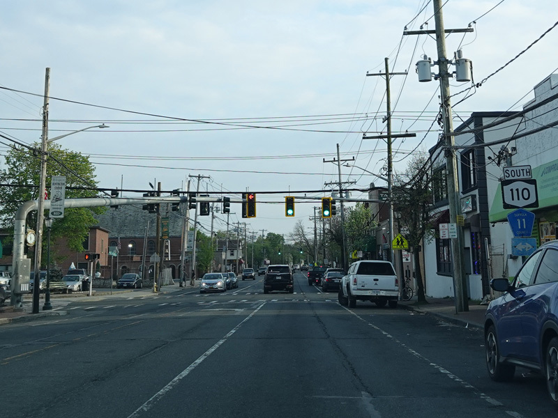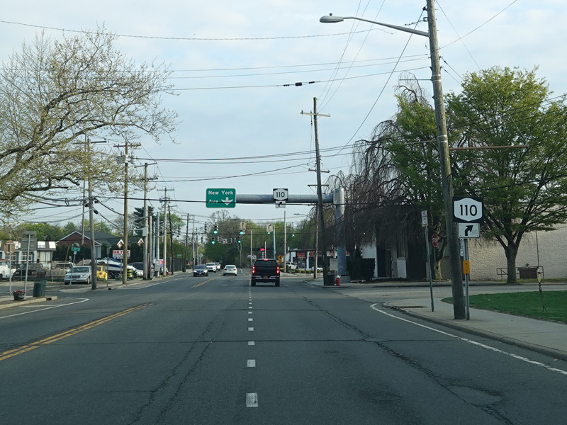 Use the left lane here to stay on New York Avenue, which becomes an unnumbered town road south of this point. NY 110 splits off to the right as Walt Whitman Road.