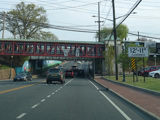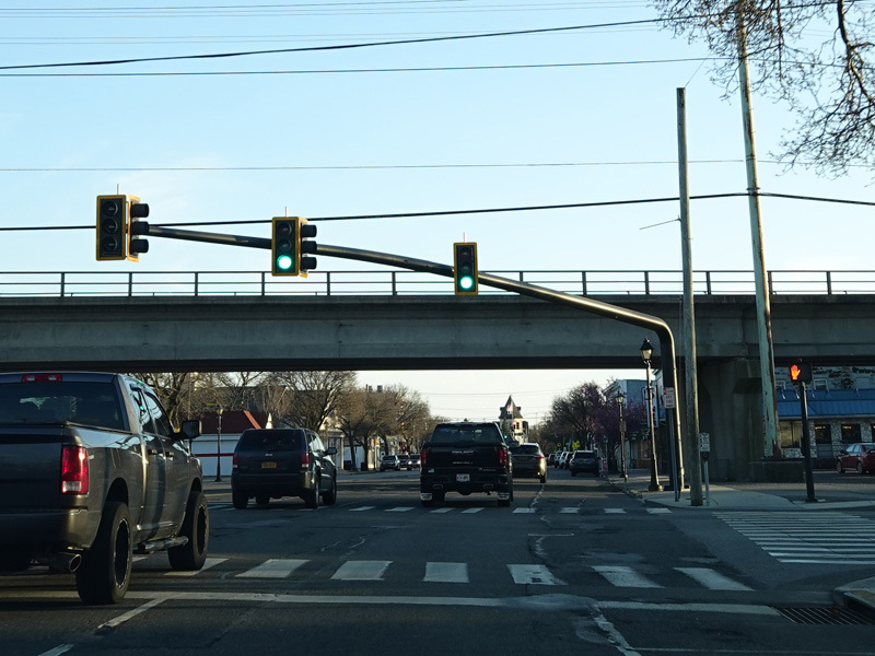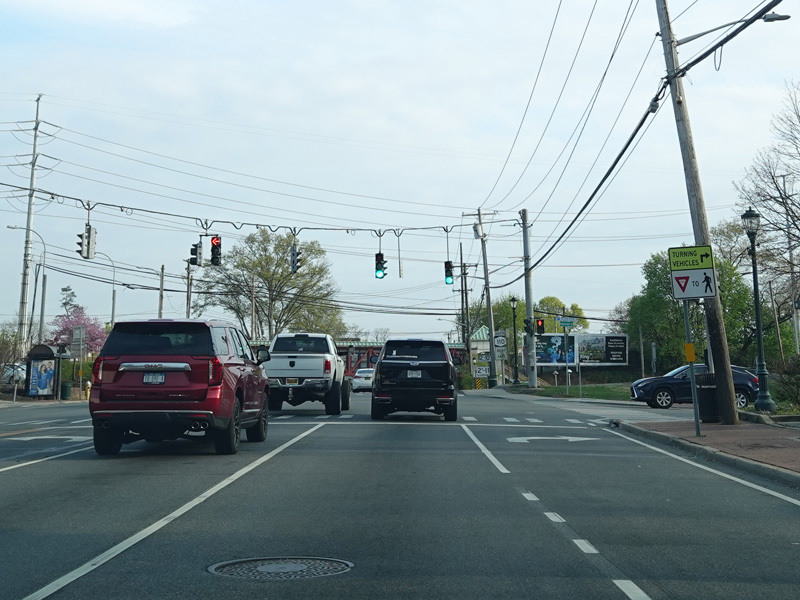 New York Avenue passes under the Huntington Branch of the Long Island Rail Road. Then, there is a traffic light at Depot Road. The left lane becomes a left turn lane.
