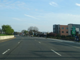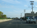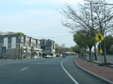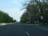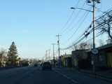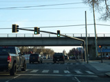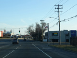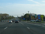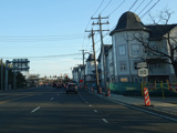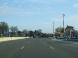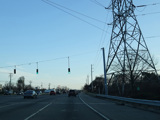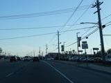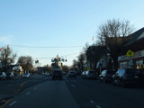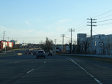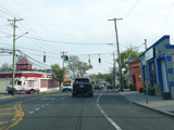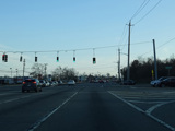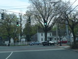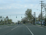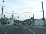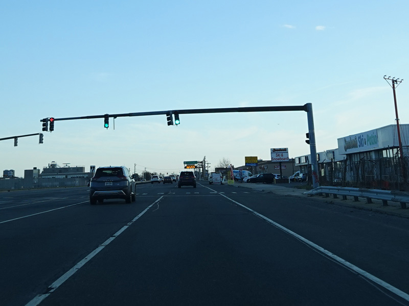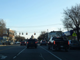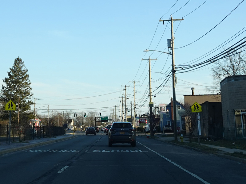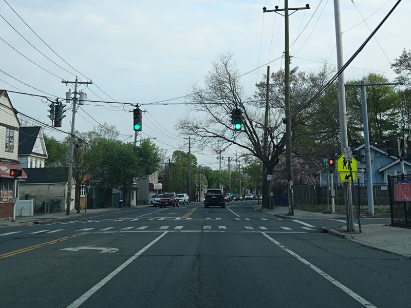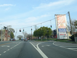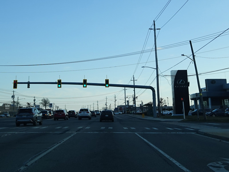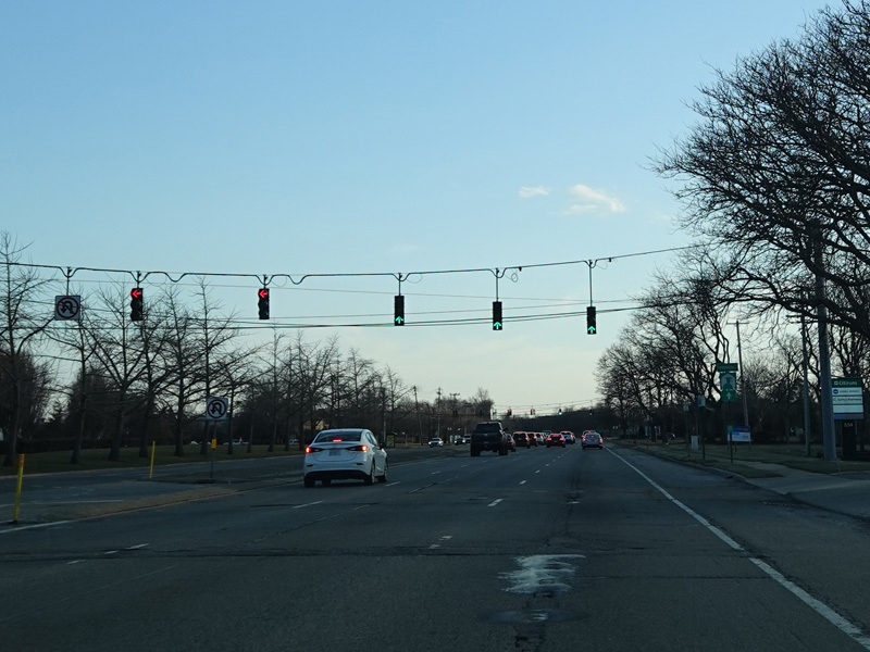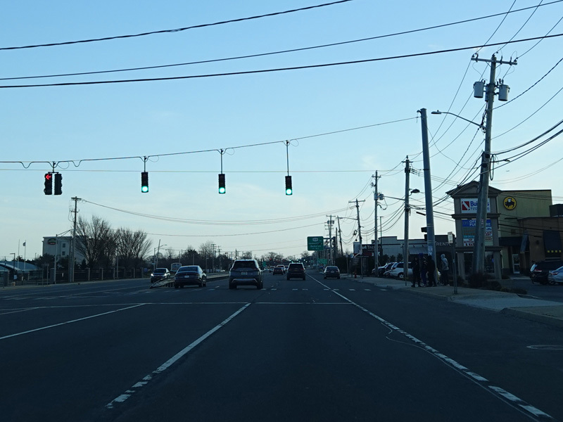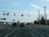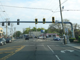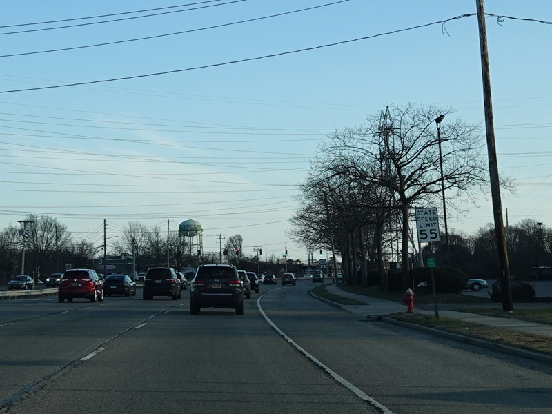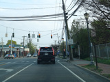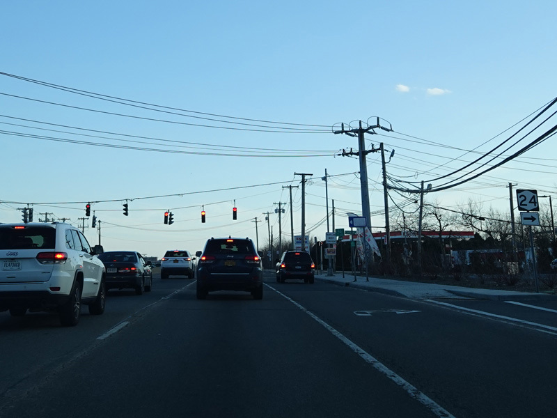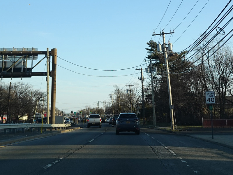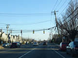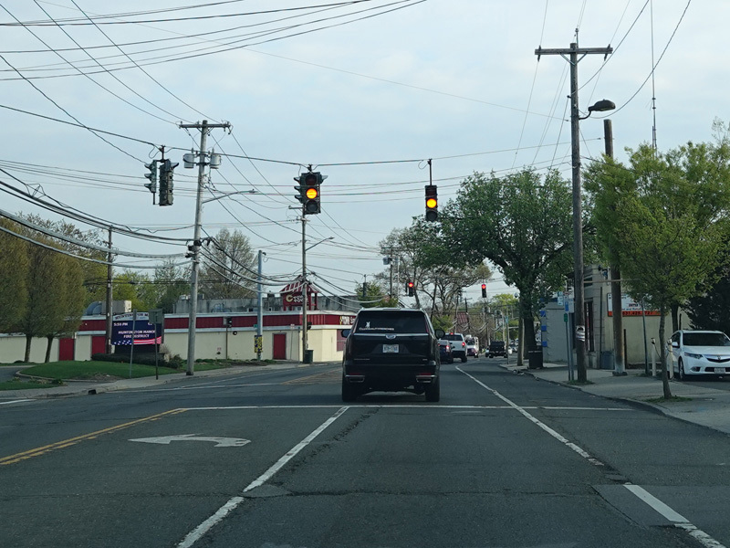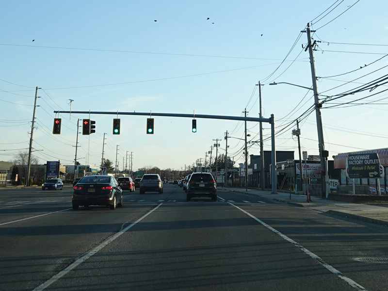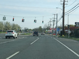 The median ends. Dixon Avenue (CR 2) begins on the left at a traffic light. There is no county route signage at this intersection.