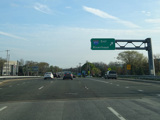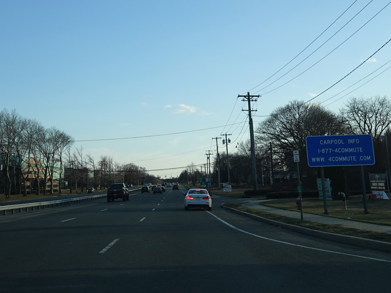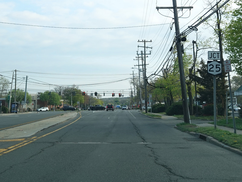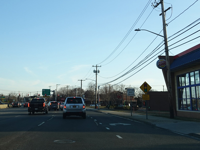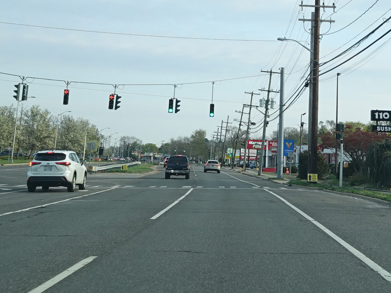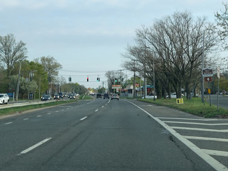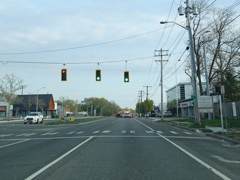 Just south of the split, Walt Whitman Road becomes a divided road. There is a traffic light at Jericho Turnpike (NY 25). Turn left to go east or right to go west.
