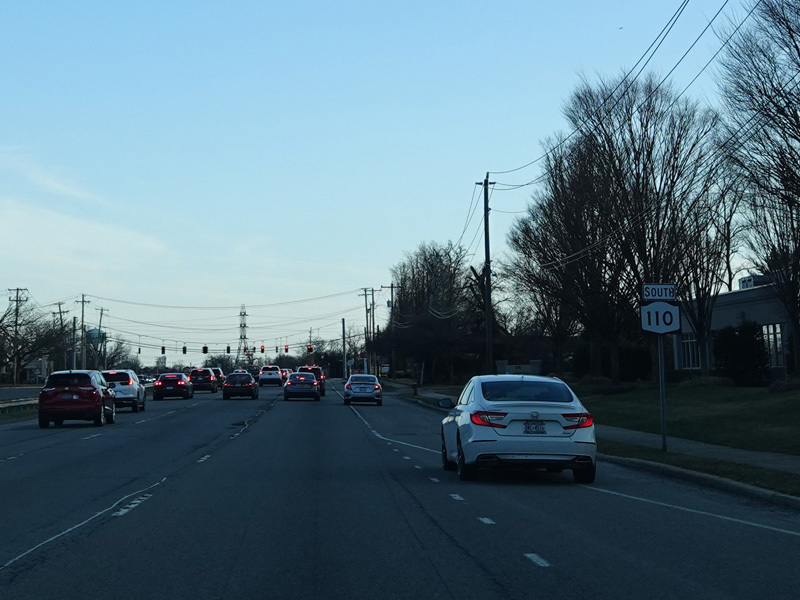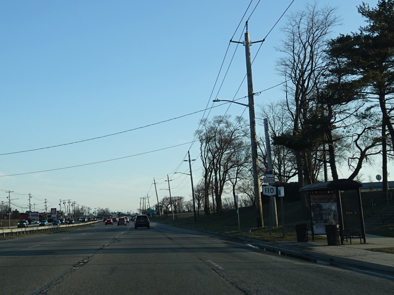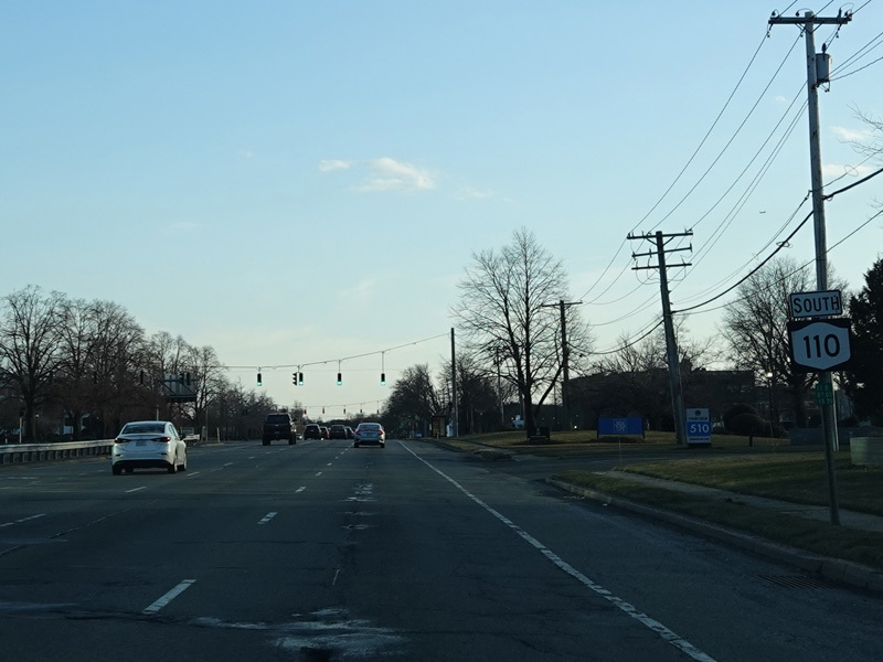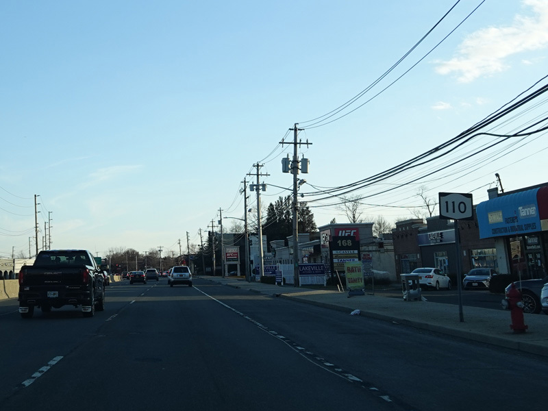 There is a traffic light at Old Country Road. Turn left to go east or right to go west. Walt Whitman Road splits off to the right to become a local street. Continue straight ahead onto Broad Hollow Road to stay on NY 110.