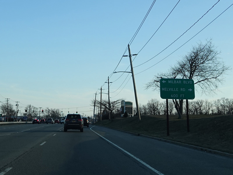 Broad Hollow Road continues south from Melville to Farmingdale. There are traffic lights at Duryea Road, Walt Whitman Road, Milbar Boulevard, and Melville Road. Ruland Road (CR 5) also begins on the left at one of the traffic lights, but there is no county route signage for it.