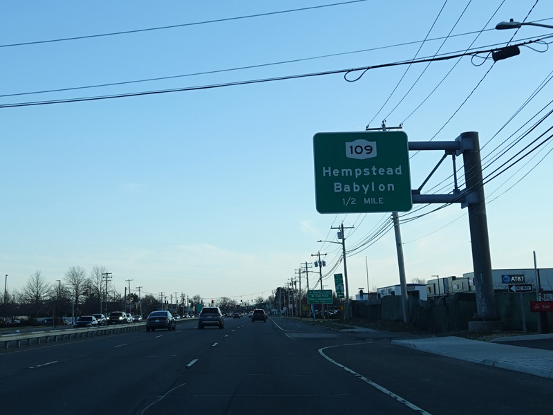 Broadway ends at a traffic light at Merrick Road (NY 27A). Turn left to go east or right to go west.