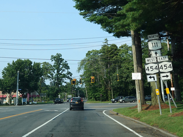 NY 111 is a major north/south route in central Suffolk. It begins at Montauk Highway (NY 27A) in Islip and runs north with interchanges at Sunrise Highway (NY 27) and the Southern Parkway. When NY 111 crosses Suffolk Avenue (CR 100), it changes names to become Joshua's Path. Just south of the Long Island Expressway (I-495), Joshua's Path merges into Wheeler Road (CR 17). CR 17 ends and Wheeler Road takes on the NY 111 designation. Just north of Veterans Highway (NY 454), Wheeler Road merges into Townline Road (CR 76). One block to the east, NY 111 splits off from CR 76 as Hauppauge Road. It continues north to the point where Main Street (NY 25/NY 25A) splits into Middle Country Road (NY 25) and North Country Road (NY 25A) and ends there.