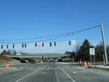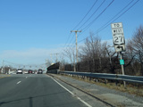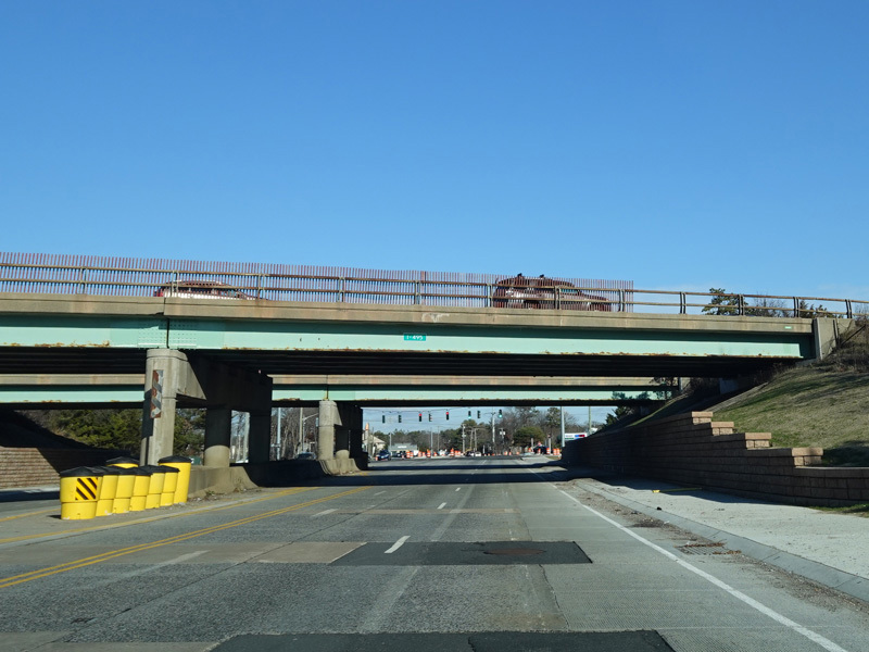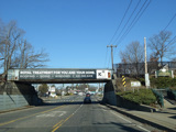 NY 112 passes under the Main Line of the Long Island Rail Road. Immediately thereafter, there is a traffic light at Long Island Avenue.