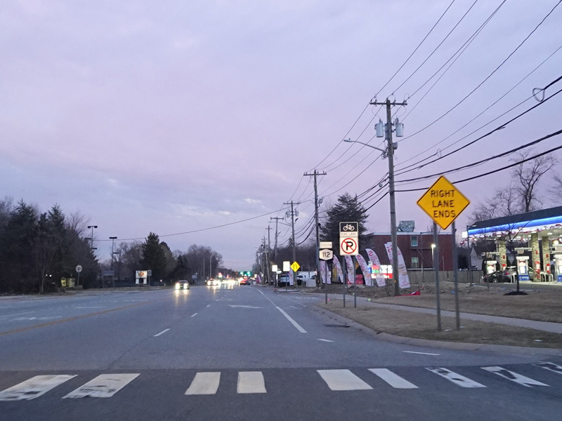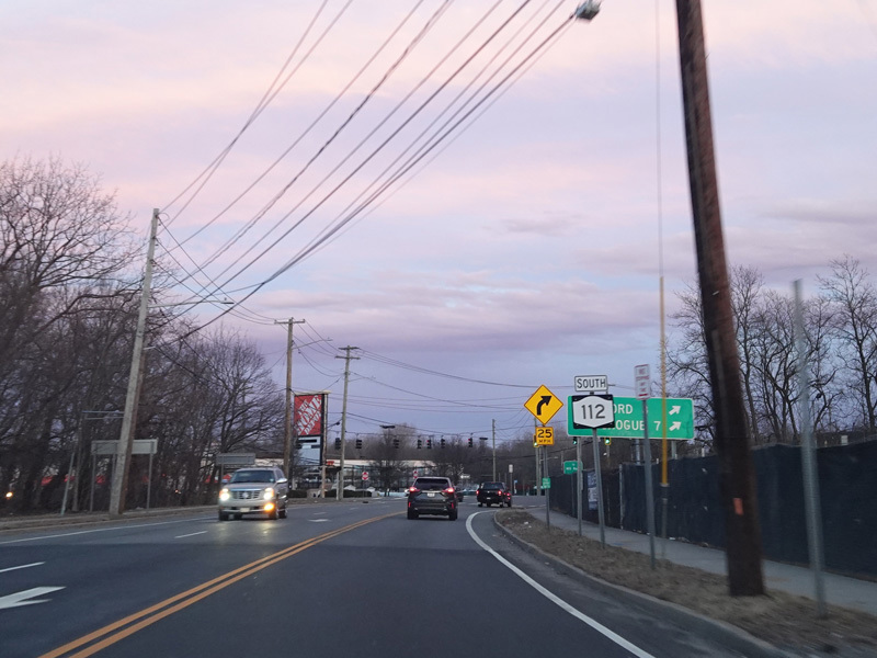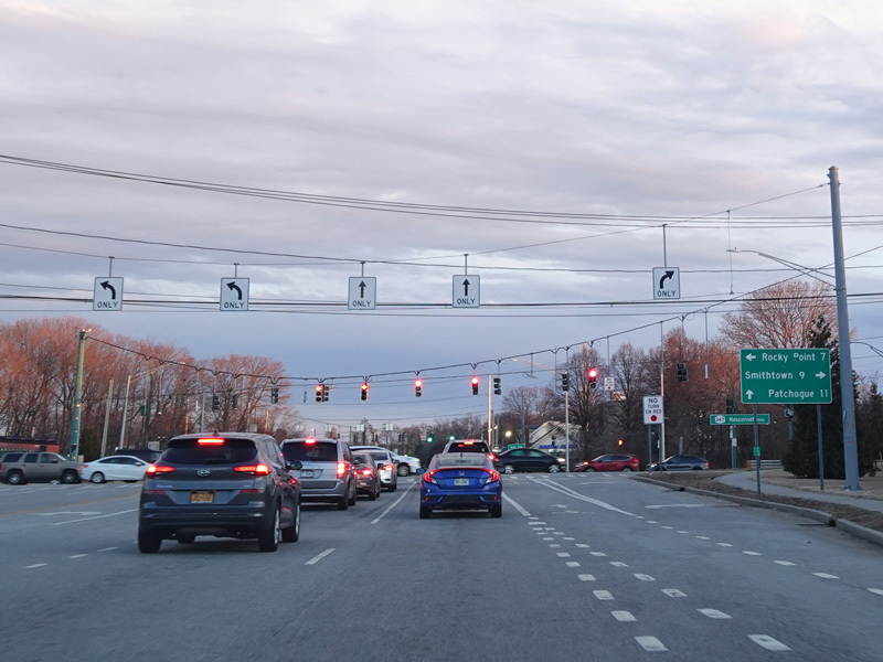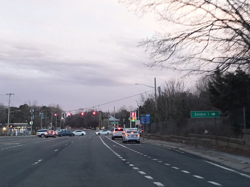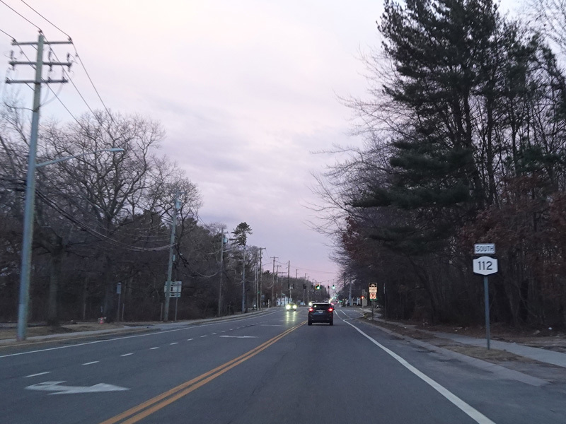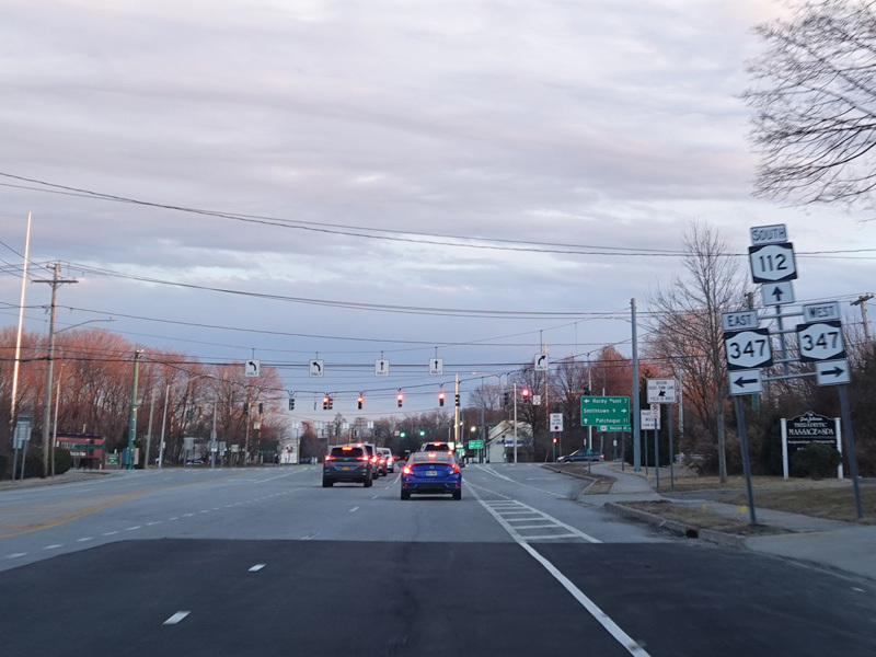 NY 112 widens to four lanes. There is a traffic light at Nesconset Highway (NY 347). Turn left to go east or right to go west.