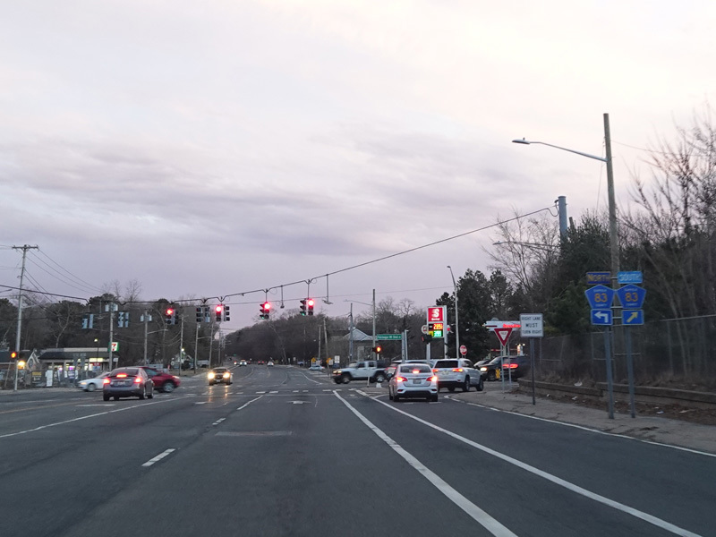 There is a traffic light at Patchogue-Mount Sinai Road (CR 83). Turn left to go north or right to go south. There is inconsistent signage here, with one sign referring to North Ocean Avenue instead of Patchogue-Mount Sinai Road.