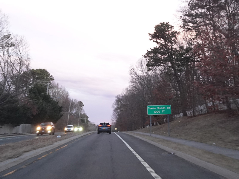 NY 112 continues to the south. There is a traffic light at Towne Woods Road and an uncontrolled intersection at Old Town Road.