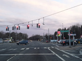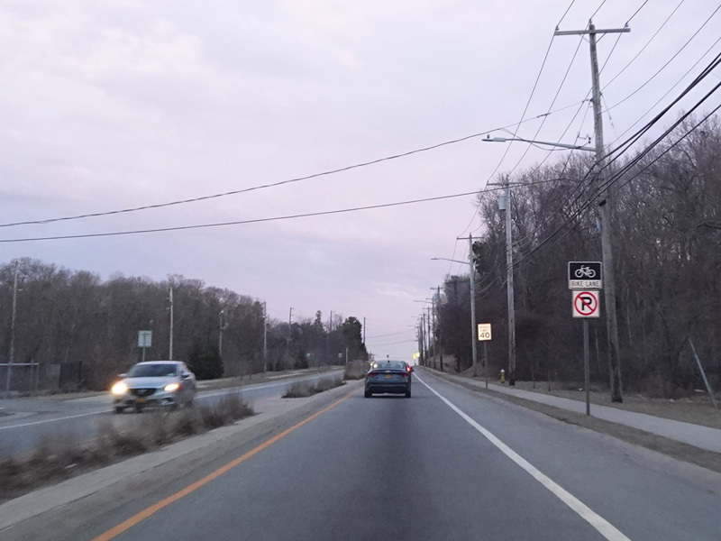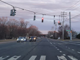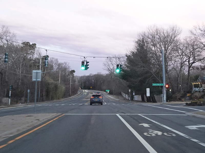 NY 112 narrows back down to two lanes. There are traffic lights at Bicycle Path, Washington Avenue, Wedgewood Drive, East Gate, and Pine Road.