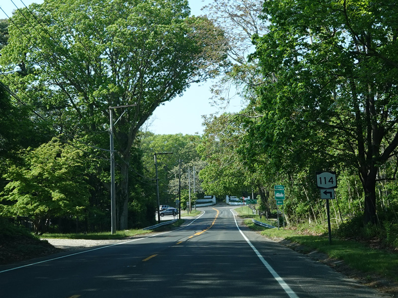There is a traffic circle. NY 114 continues to the right. Tyndall Road is straight ahead. Short Beach Road (CR 60) is to the left.