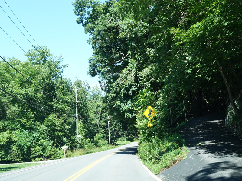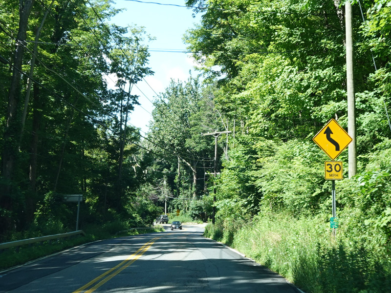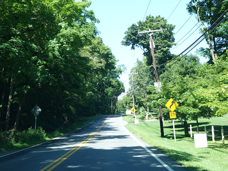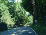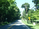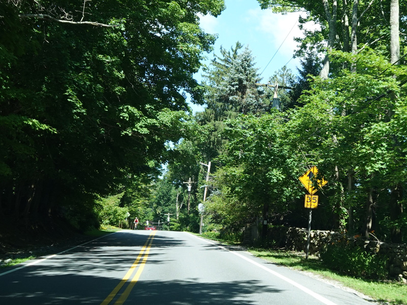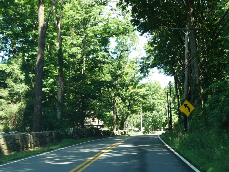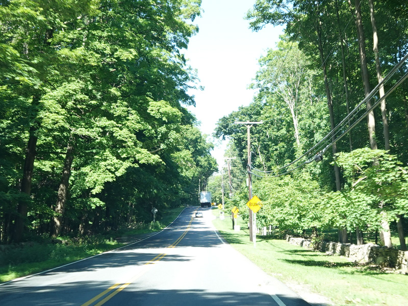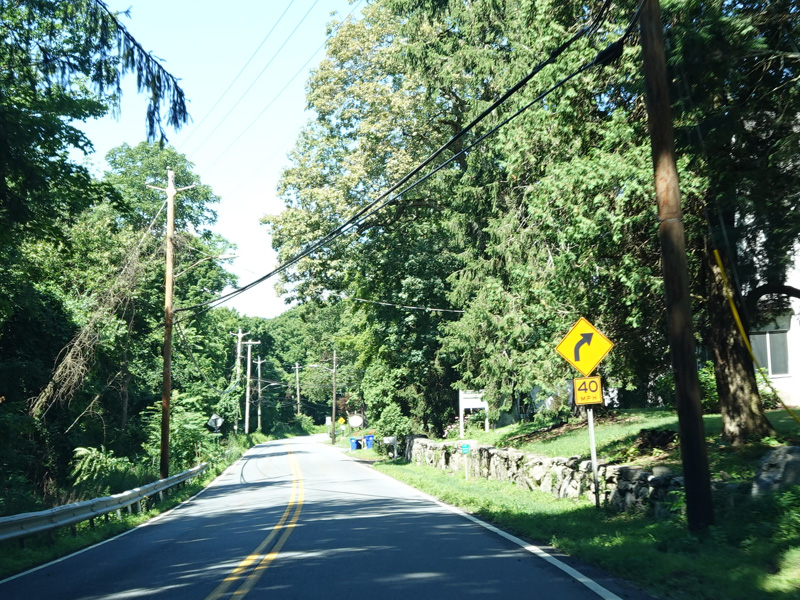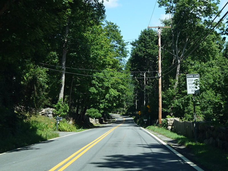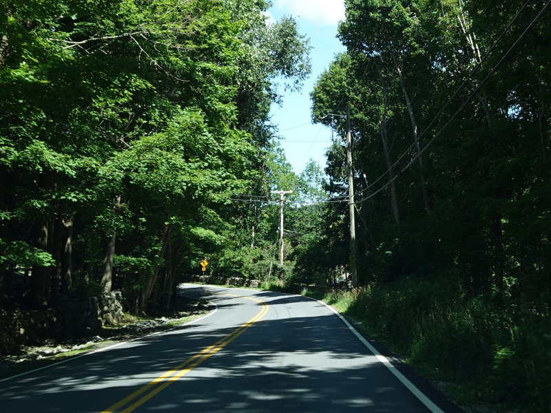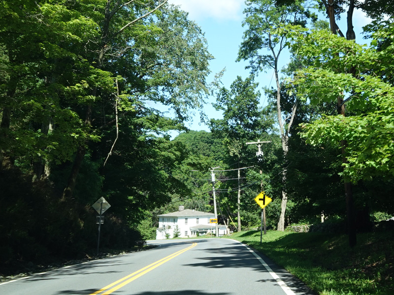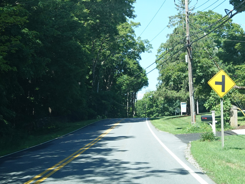 Titicus Road continues west as a two-lane undivided road. The Titicus Reservoir is on the left, although the view of the water is mostly blocked by the trees during the summer months.