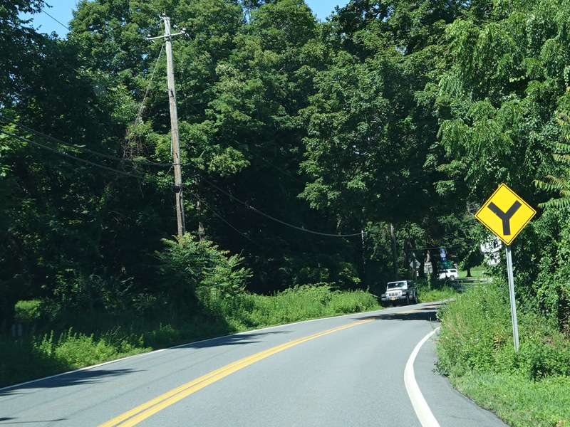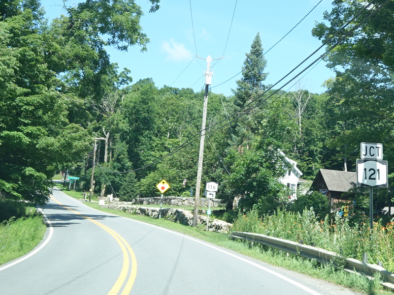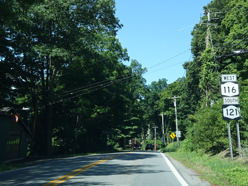 The two routes split. Bear left onto Grant Road for NY 121. Bear right to stay on NY 116.