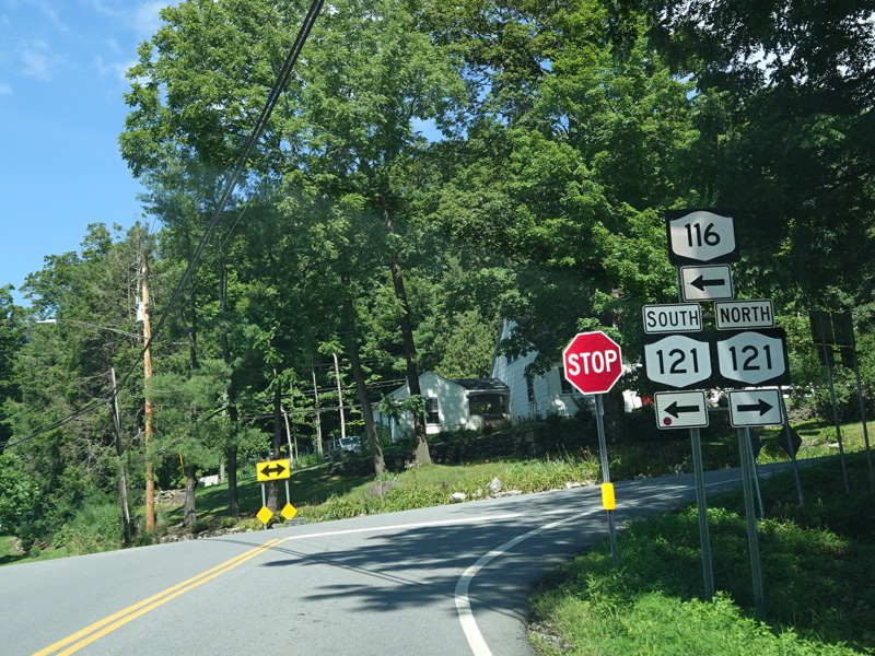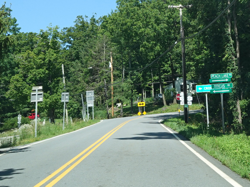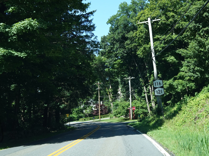 There is a stop sign at NY 121. Turn right onto Peach Lake Road to go north. Turn left to stay on Titicus Road to go south and to continue on NY 116.