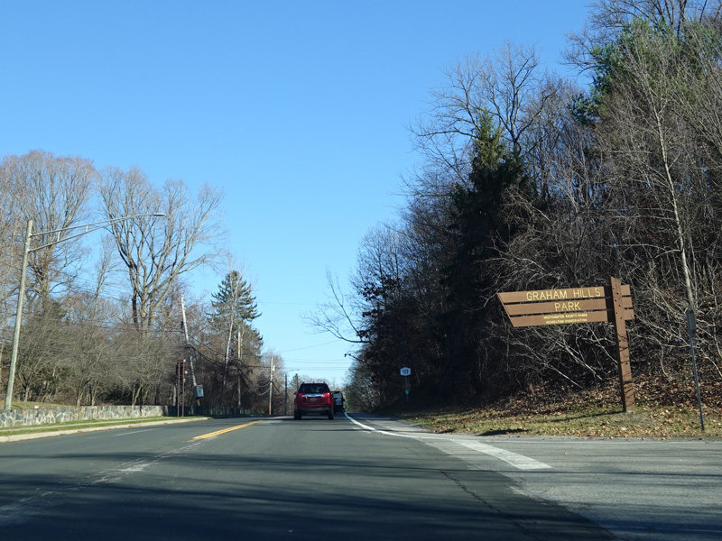 East of the parkways, Bedford Road narrows down to two lanes. There is an entrance to Graham Hills Park.