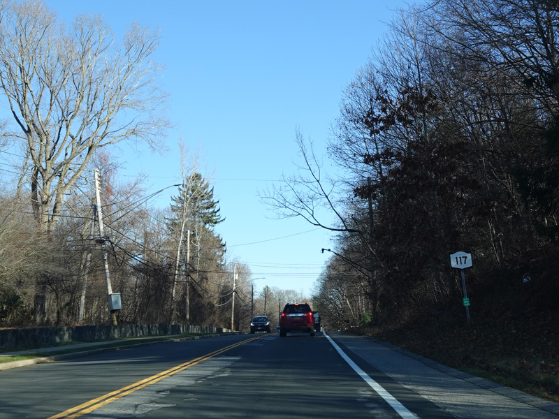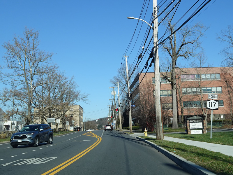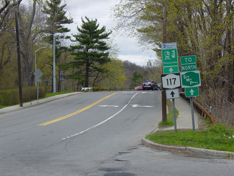 The roadway splits here. Bear left onto Manville Road to stay on NY 117. Bedford Road continues straight ahead as CR 27A. The signage here makes it look like Manville Road is a truck route of NY 117, while it is actually the mainline. One of the signs also erroneously marks NY 117 as US 117.