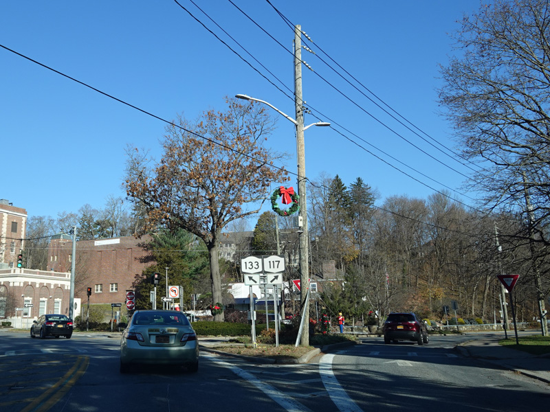 The roadway splits. Bear right onto North Bedford Road to stay on NY 117. Continue straight ahead for East Main Street (NY 133), which begins here.