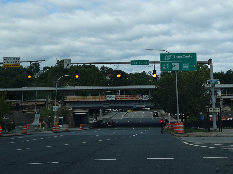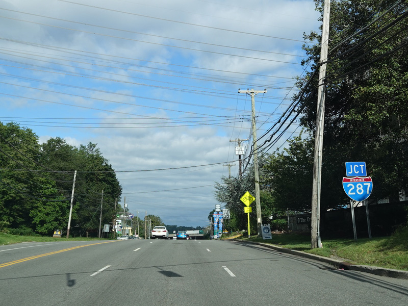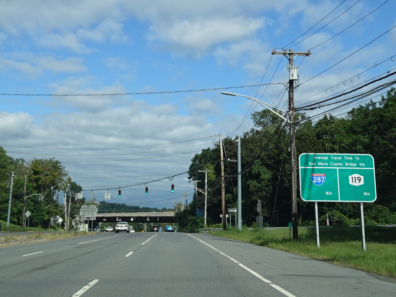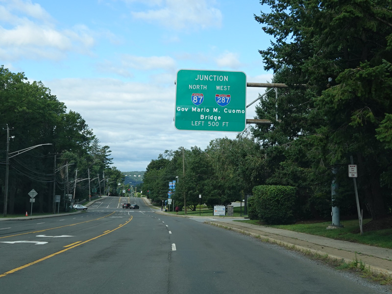 There is a northbound entrance to the New York Thruway (I-87/I-287) on the left. The entrance leads directly onto the Governor Mario M. Cuomo Bridge, formerly known as the Tappan Zee Bridge.