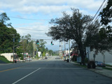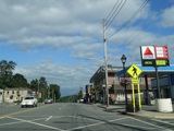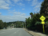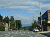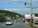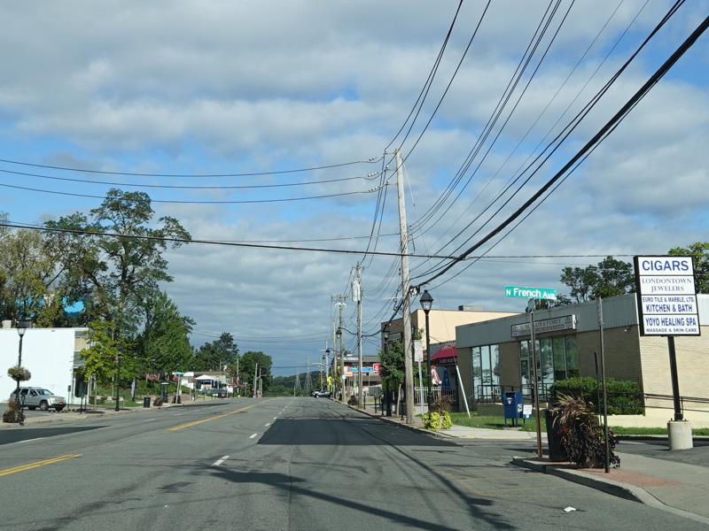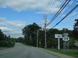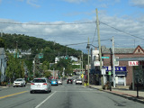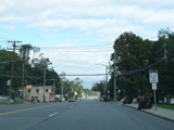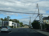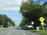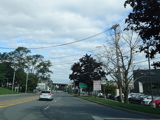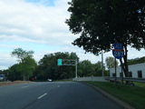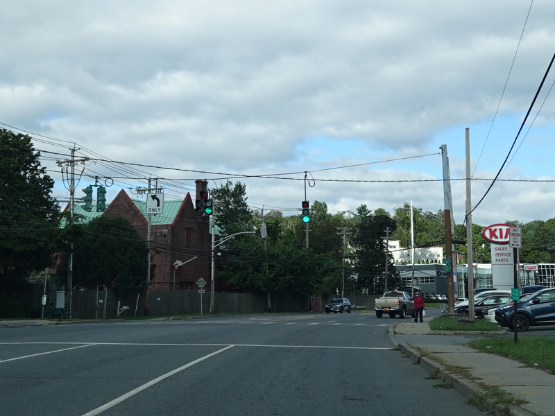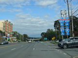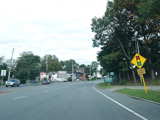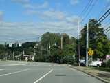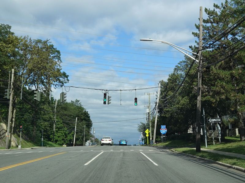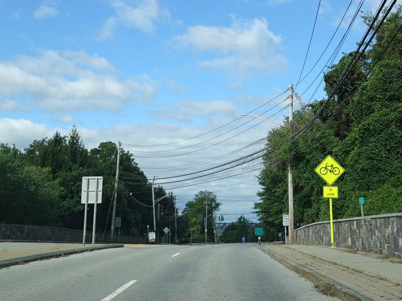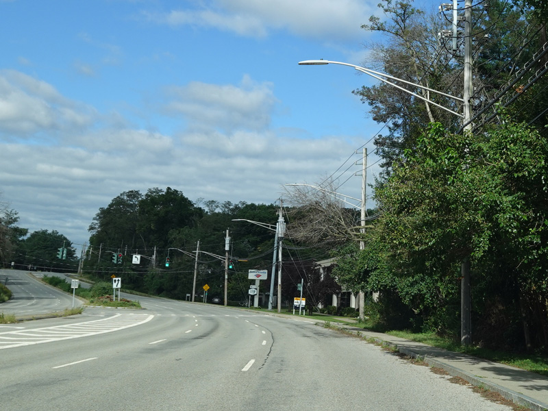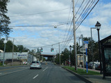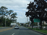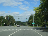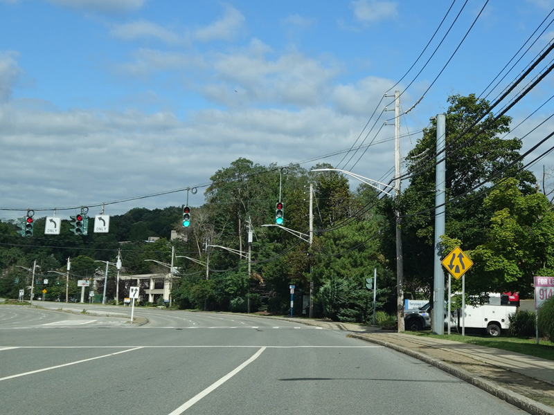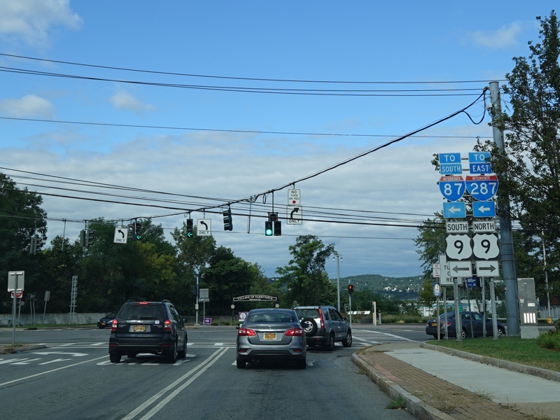 White Plains Road ends here at Broadway (US 9) in Tarrytown. Turn right to go north or left to go south. Also, turn left for a southbound entrance to the New York Thruway (I-87/I-287).